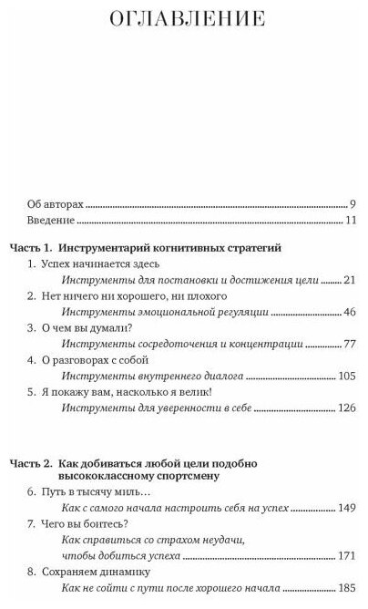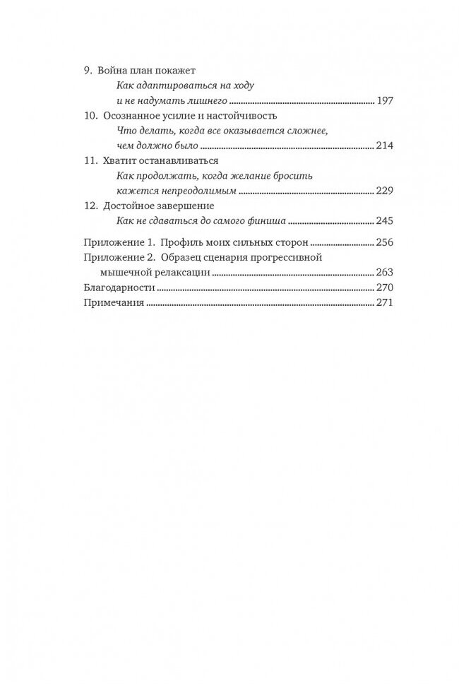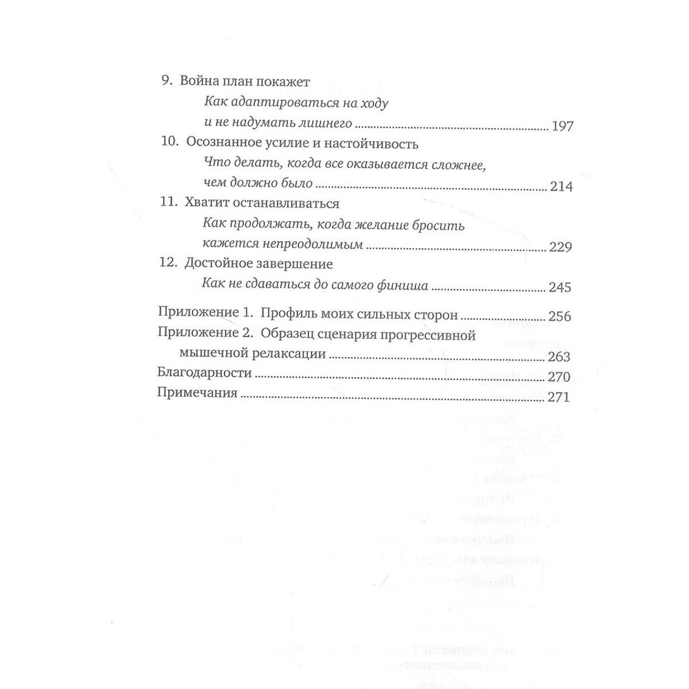 Брик и Дуглас соединяют новаторскую науку с конкретными кейсами из мира спорта, показывая, как легендарный марафонец Меб Кефлезиги работает со своим внутренним диалогом или как планирование по модели "если - то" помогло великому пловцу Майклу Фелпсу завоевать очередную золотую медаль на Олимпийских играх. В этой книге нет банальных списков очевидных советов; вместо прописных истин здесь много прикладной науки и много практики - психологических упражнений, таблиц-анкет для заполнения, а также полезные приложения: опросник "Профиль моих сильных сторон" (его можно заполнить еще до начала чтения книги, чтобы в конце оценить свой прогресс) и сценарий прогрессивной мышечной релаксации (техника, способствующая снижению стресса и тревоги как на телесном, так и на эмоциональном уровне).