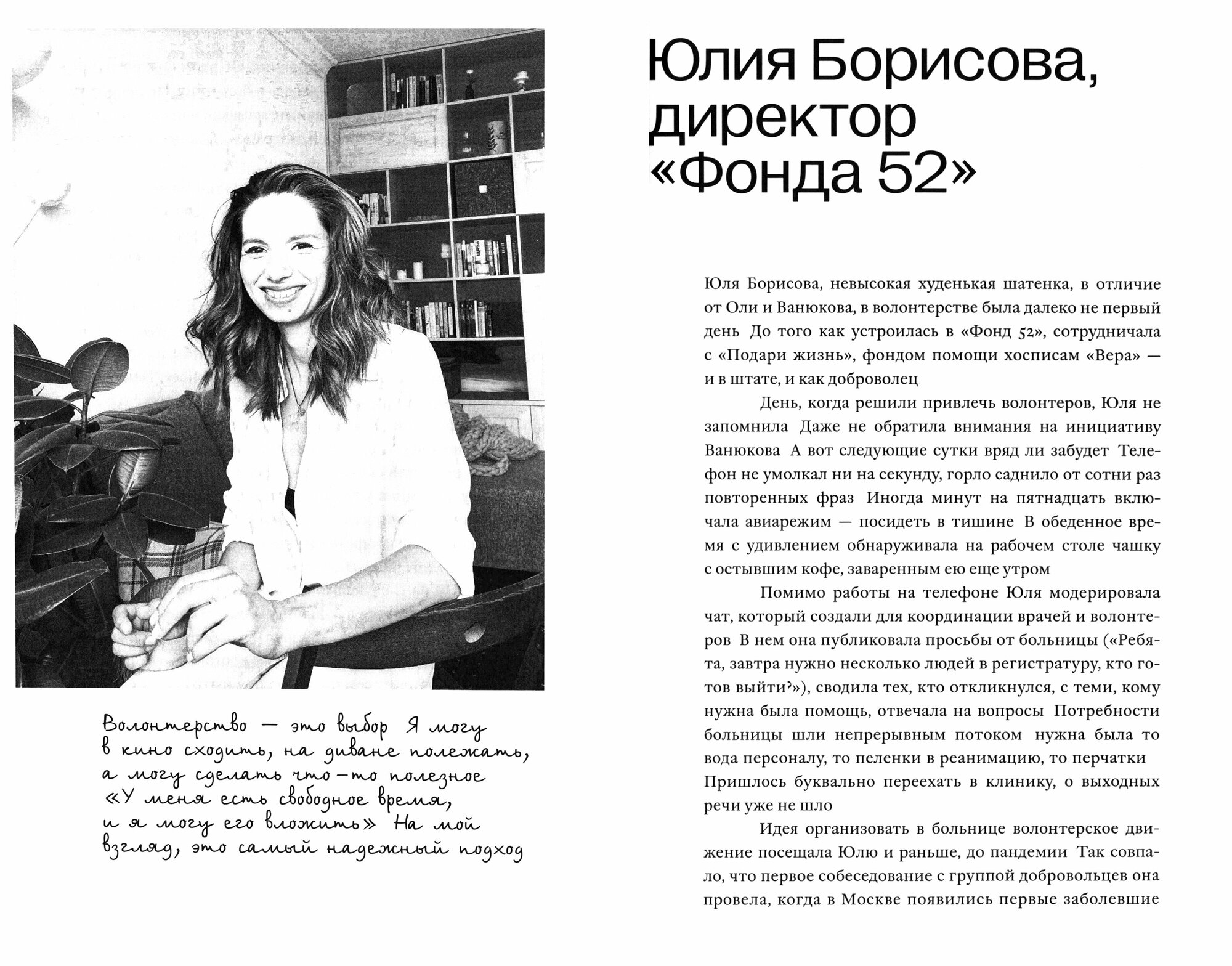 Сегодня силы героев этой книги задействованы в основном в ковидных госпиталях. Добровольцы пришли на помощь врачам, когда у тех не было свободной минуты и сил на то, чтобы перестраивать систему. Ковид высветил серьезные проблемы в нашем здравоохранении, связанные с ориентацией на кого угодно, кроме пациента. Было доказано, что в больницах, где трудятся волонтеры, пациенты быстрее идут на поправку. Книга наглядно показывает, что добровольческое движение должно существовать и дальше, после того как ковид отступит, так как оно открывает для медицины огромные возможности.