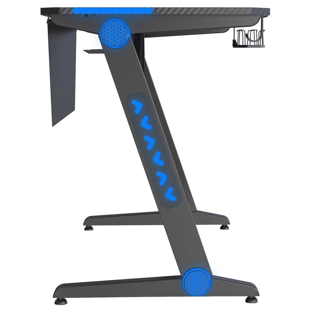 Стильный дизайн с регулируемой подсветкой и со столешницей выполненной из МДФ, имеет максимально допустимую нагрузку 80 кг. Удобный стол оснащен подвесом для наушников, подстаканником и держателем для сетевого удлинителя.