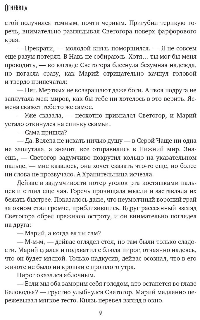 Я влюбилась в этого автора ещё после прочтения книги Ведьмина Дорога. Узнала, что выходит следующая и сразу же приняла решение о покупке. Сама книга не является как таковым продолжением Ведьминой Дороги, но происходит в той же вселенной и одним из главных персонажей является второстепенный персонаж из первой книги. Огневица ни чуть не хуже Ведьминой Дороги, она больше по содержанию, а так же нам рассказывают больше о магах и самом устройстве мира. Любовная линия очень приятная и милая, она не занимает главное место в данной книге. Слог автора довольно лёгкий, но чтобы полностью проникнуться атмосферой стоит начать с Ведьминой Дороги, там объясняются некоторые термины. Меня захватила эта придуманная вселенная. Сама книга довольно объемная, страницы белые, из плотной бумаги. Очень красивое оформление внутри. Советую к прочтению тем, кто любит фэнтези в славянской тематике, потому что думаю, что книга к этому очень близка.