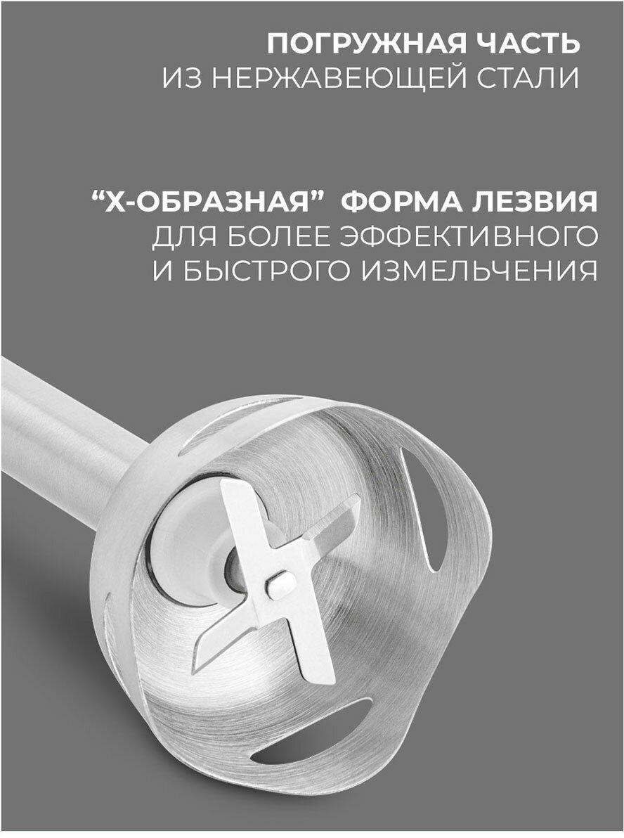 Блендерный набор с максимальной мощностью 1200 Вт поможет вам легко и быстро воплощать в жизнь самые затейливые кулинарные фантазии. Погружная часть и рабочие лезвия прибора выполнены из высококачественной нержавеющей стали, что гарантирует ему длительный срок безупречной службы. Блендер оснащен современным DC-мотором с низким уровнем шума, поэтому вы сможете включать прибор в утренние или вечерние часы. Особому комфорту в использовании устройства способствует световой индикатор работы в виде LED-подсветки. Специальный регулятор плавно переключает скорости блендера. В устройстве также предусмотрен режим TURBO — для самых твердых и плотных ингредиентов. Благодаря венчику, входящему в комплектацию блендера, вы можете не только измельчать, но и взбивать. В набор также входят рабочая чаша объемом 650 мл и стакан для смешивания объемом 800 мл. Пользоваться прибором очень удобно: ручка блендера имеет особое покрытие, благодаря которому он не будет скользить в процессе использования. Купите блендерный набор и занимайтесь кулинарным творчеством каждый день!