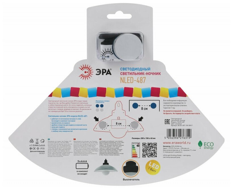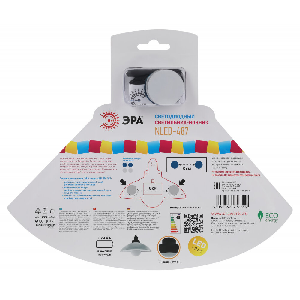Автономный светильник-ночник на стену ЭРА NLED-487-1W-SW-P со светодиодами (LED), с выключателем на корпусе. Дизайн корпуса ночника выполнен в форме подвесного светильника в стиле ретро. Светильник автономный, работает от элементов питания 3 х ААА (не входят в комплект поставки). Светильник легко крепится к любому типу поверхностей и легко снимается для подзарядки благодаря магнитным стикерам, входящим в комплект. Светильник можно подвесить при помощи шнура длиной 1 м (в комплекте): в верхней части светильника имеется удобное отверстие для подвеса. Светодиодный светильник-ночник ЭРА станет отличным элементом декора и создаст яркую подсветку там, где Вам удобно! Легкий доступ к батарейкам для замены.