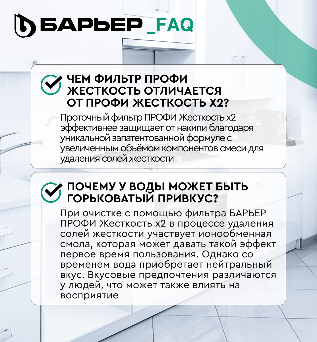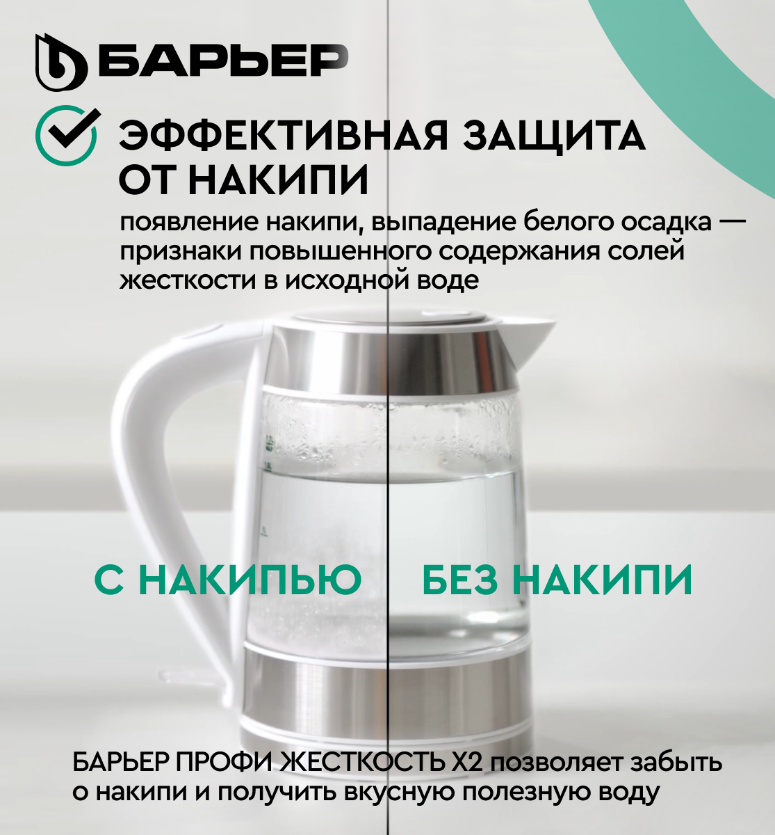 - "БАРЬЕР ПРОФИ Смягчение х2" второй этап умягчения и легкое кондиционирование. Фильтрующая смесь эффективно понижает жесткость воды.