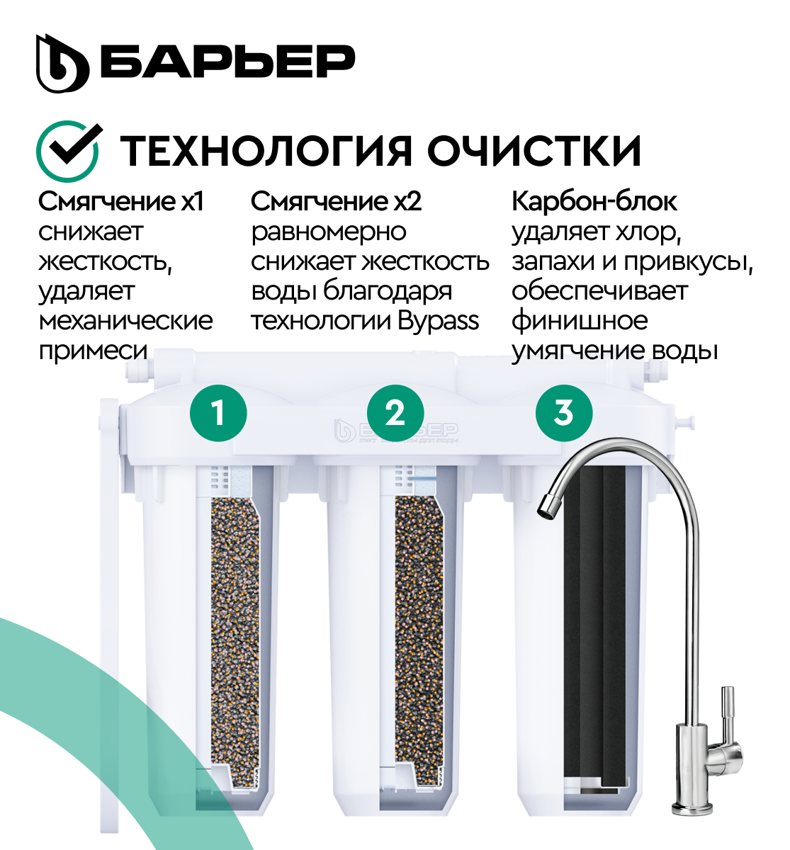 - "БАРЬЕР ПРОФИ Смягчение х1» предварительная очистка и первый этап умягчения. Комбинация фильтрующих материалов снижает жесткость, удаляет хлор и его соединения.