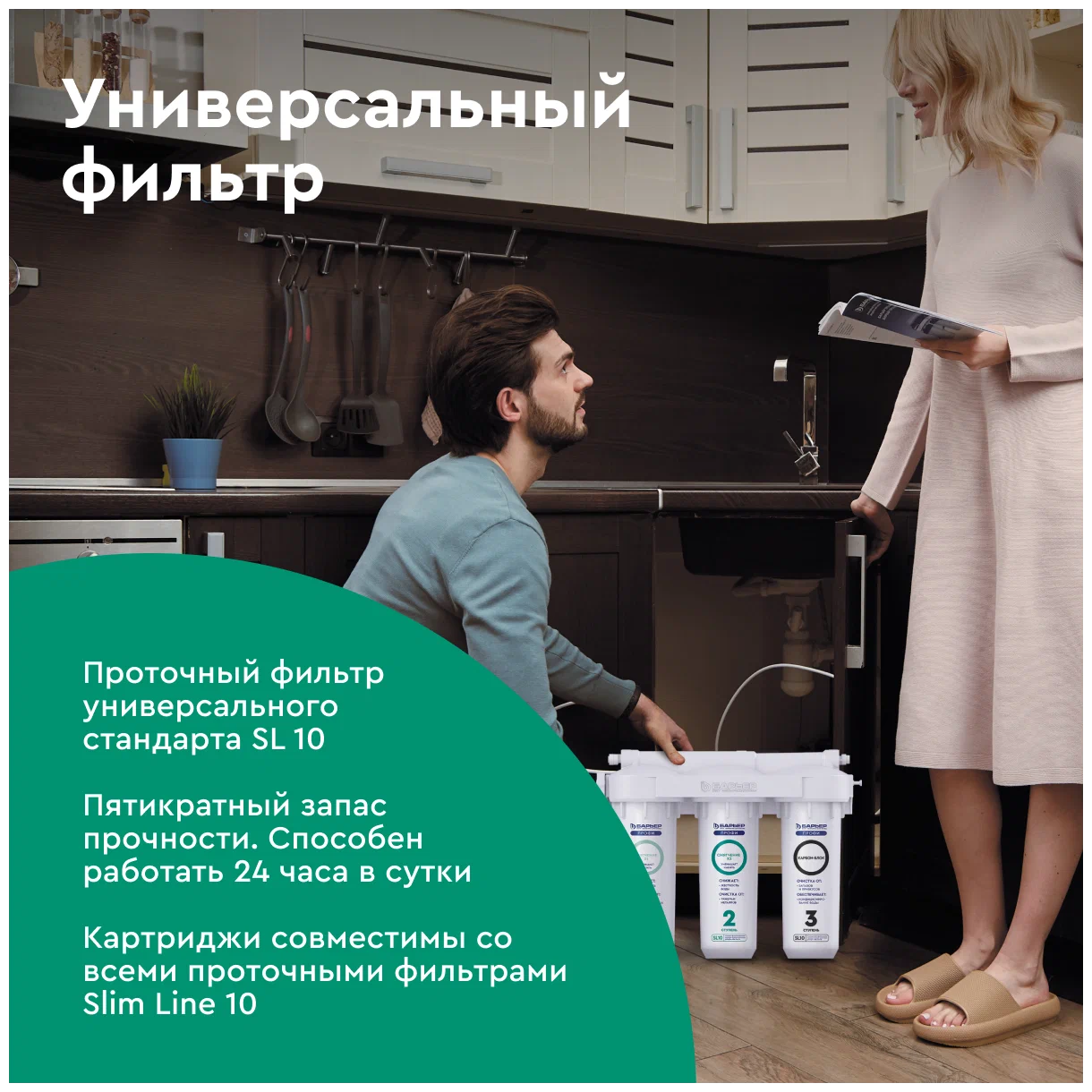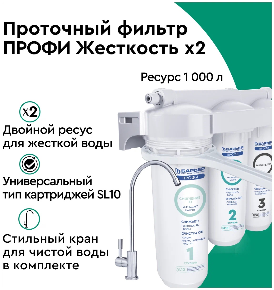 Вкусная чистая вода без накипи! Классический 3-х ступенчатый фильтр с картриджами стандарта SlimLine 10" для доочистки очень жёсткой городской воды. Благодаря увеличенному количеству умягчающей смолы в составе, БАРЬЕР ПРОФИ Жесткость х2 удаляет накипь значительно дольше, чем аналоги.