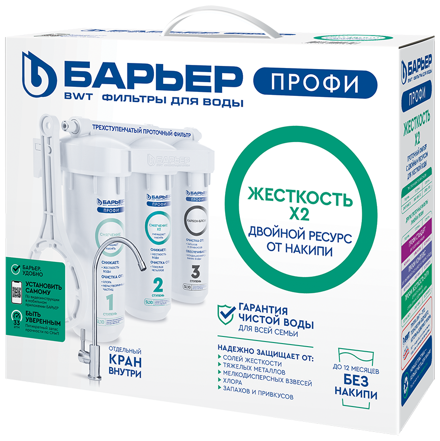 | Наименование модели | Фильтр под мойку для очистки воды трехступенчатый БАРЬЕР ПРОФИ Жесткость Х2, защищает от накипи |