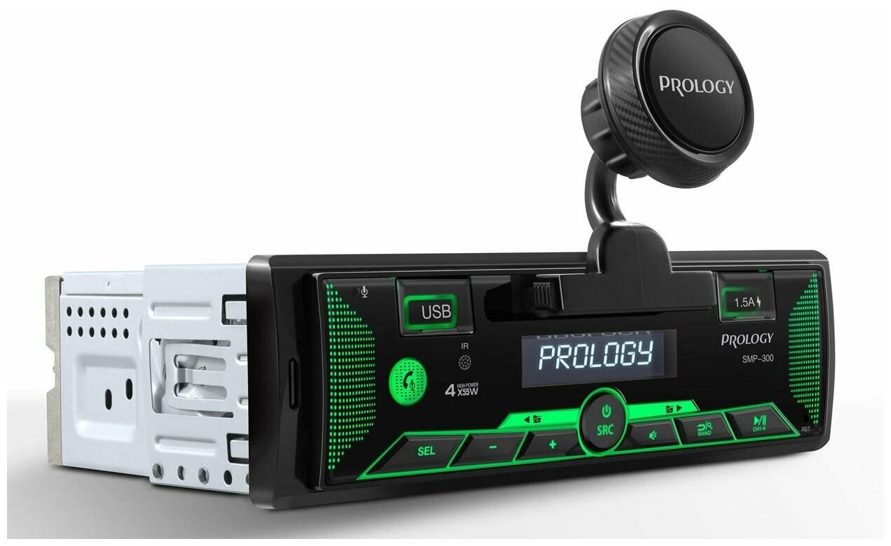 PROLOGY SMP-300 FM / USB ресивер с Bluetooth, монтажного размера 1DIN, который обеспечивает прием радиостанций в диапазонах FM/УКВ/AM, воспроизведение аудиофайлов MP3, WAV, и FLAC форматов,, записанных на USB-накопители, передачу звука с внешних источников через беспроводной интерфейс Bluetooth (ver. 4,2).