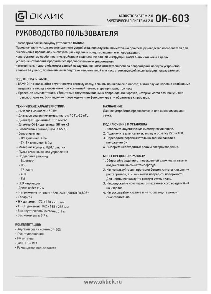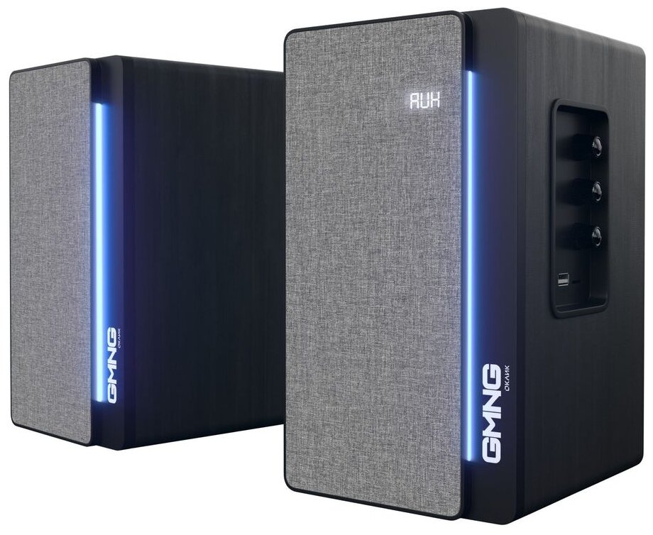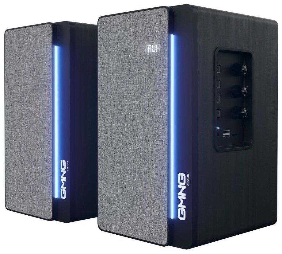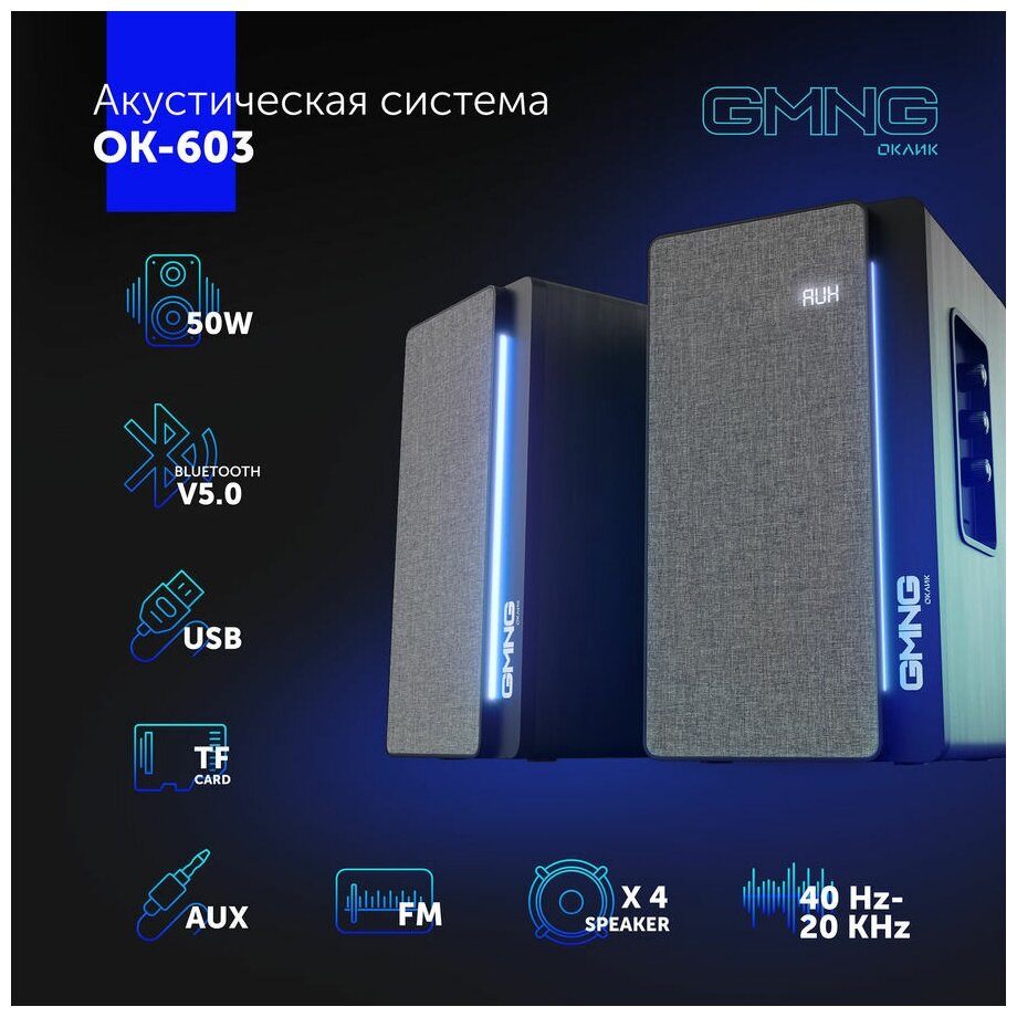 Оклик GMNG OK-603 - мощная стереосистема c беспроводным подключением. Bluetooth версии 5.0 гарантирующий стабильный прием и высокую скорость передачи сигнала. Устройство имеет классическую форму. Корпус выполнен из утолщенных плит МДФ исключающих возможность возникновения посторонних звуков корпуса. Дополнением является LED подсветка лицевых декоративных панелей. Блок управления звуком и встроенным медиаплеером вынесен на правый бок активной колонки специально под правую руку. Туда же вынесены интерфейсы для подключения носителей памяти: флеш накопителей и TF-карт. Также предусмотрено управление с помощью беспроводного пульта ДУ. Пользователь может на свое усмотрение выбирать различные способы подключения и источнику воспроизведения звука: AUX, Bluetooth, USB, TF и даже FM. Да, радио тут тоже есть.