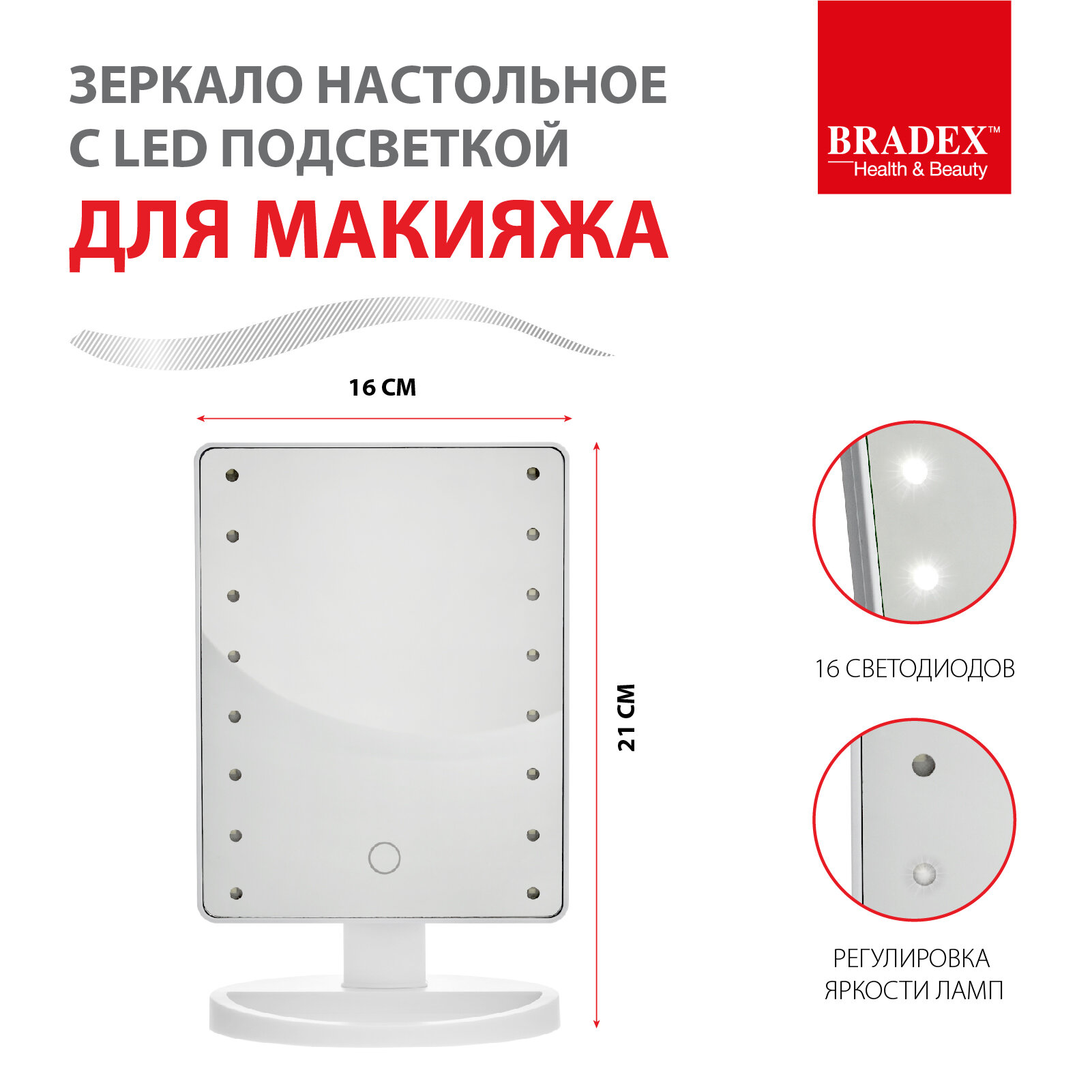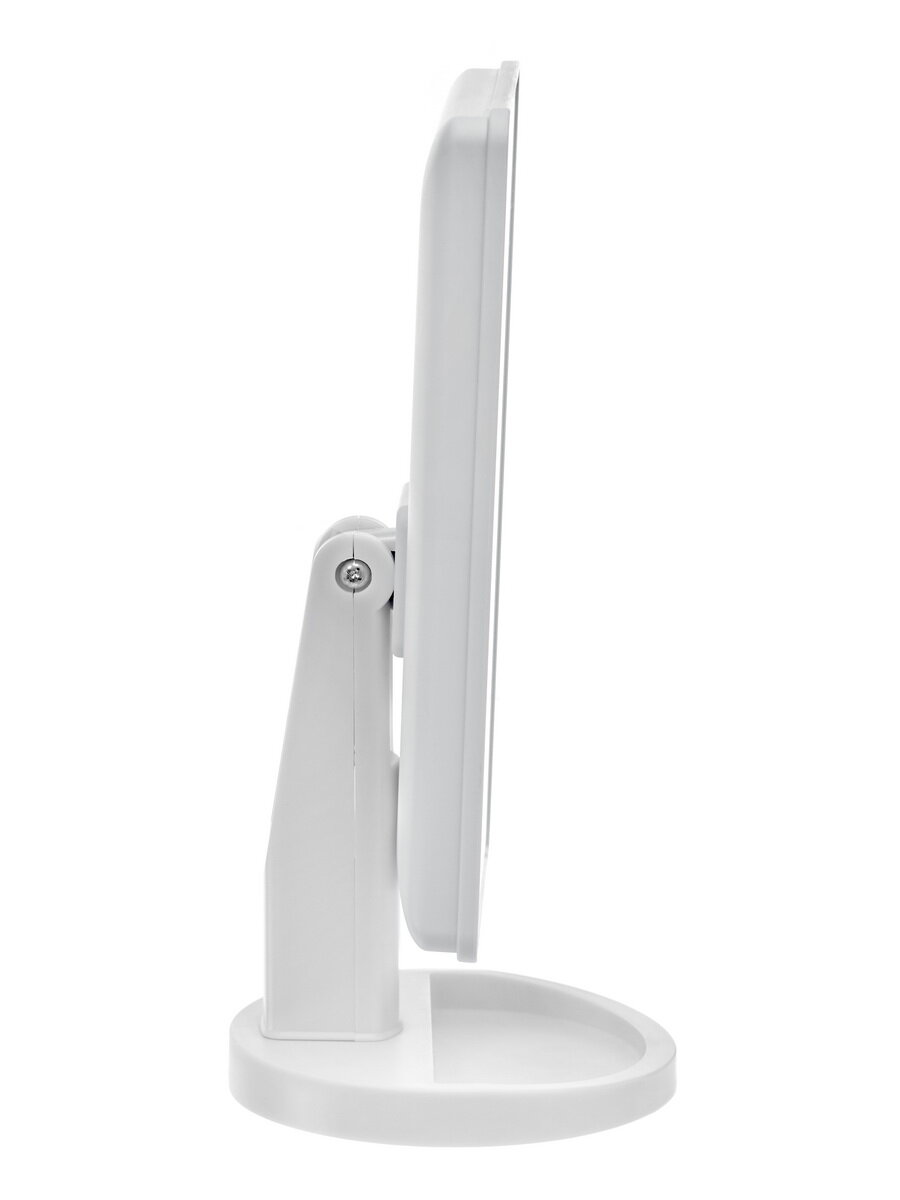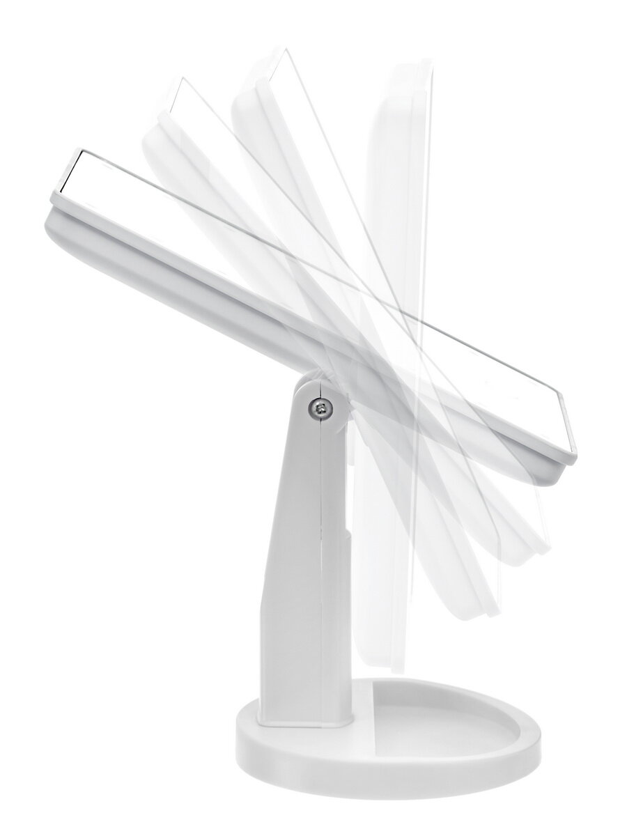 Косметическое зеркало для создания безупречного образа каждый день. Повседневный, праздничный мейкап больше не нужно наносить только при дневном свете или включив все источники света в помещении. Стильный и практичный аксессуар обеспечивает мягкое, комфортное для глаз освещение, благодаря равномерно расположенным по всей площади настольного зеркала 16 светодиодам. Прибор включается и настраивается с помощью сенсорной кнопки: предусмотрена функция регулирования яркости ламп с помощью двойного нажатия на кнопку. Регулируемый поворот зеркала на 360 градусов дает отличный угол обзора.