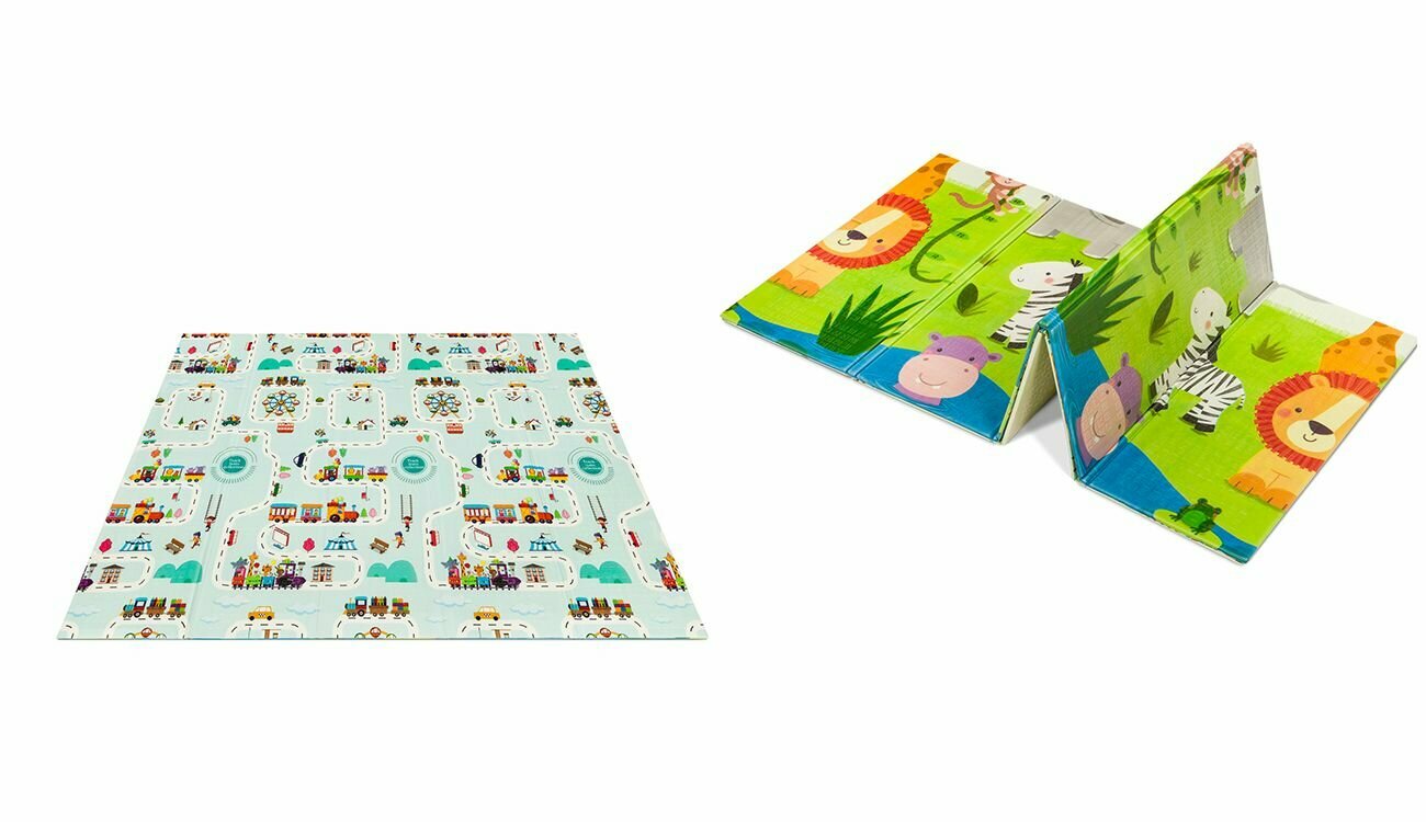 Два уникальных принта с каждой стороны - животные с одной стороны , дорога со зданиями с другой . Они помогают родителям каждый раз придумывать интересные истории и разные игровые сценарии.