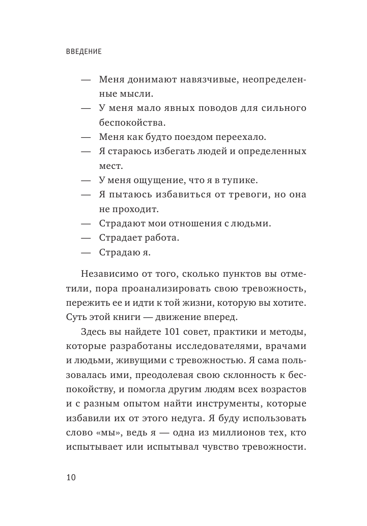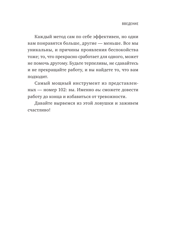 Здесь вы найдете 101 совет, практики и методы, которые разработаны исследователями, врачами и людьми, живущими с тревожностью. Я сама пользовалась ими, преодолевая свою склонность к беспокойству, и помогла другим людям всех возрастов и с разным опытом найти инструменты, которые избавили их от этого недуга. Я буду использовать слово "мы", ведь я одна из миллионов тех, кто испытывает или испытывал чувство тревожности.