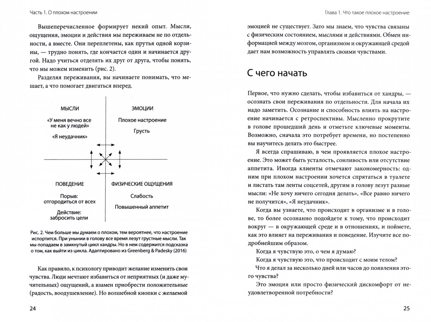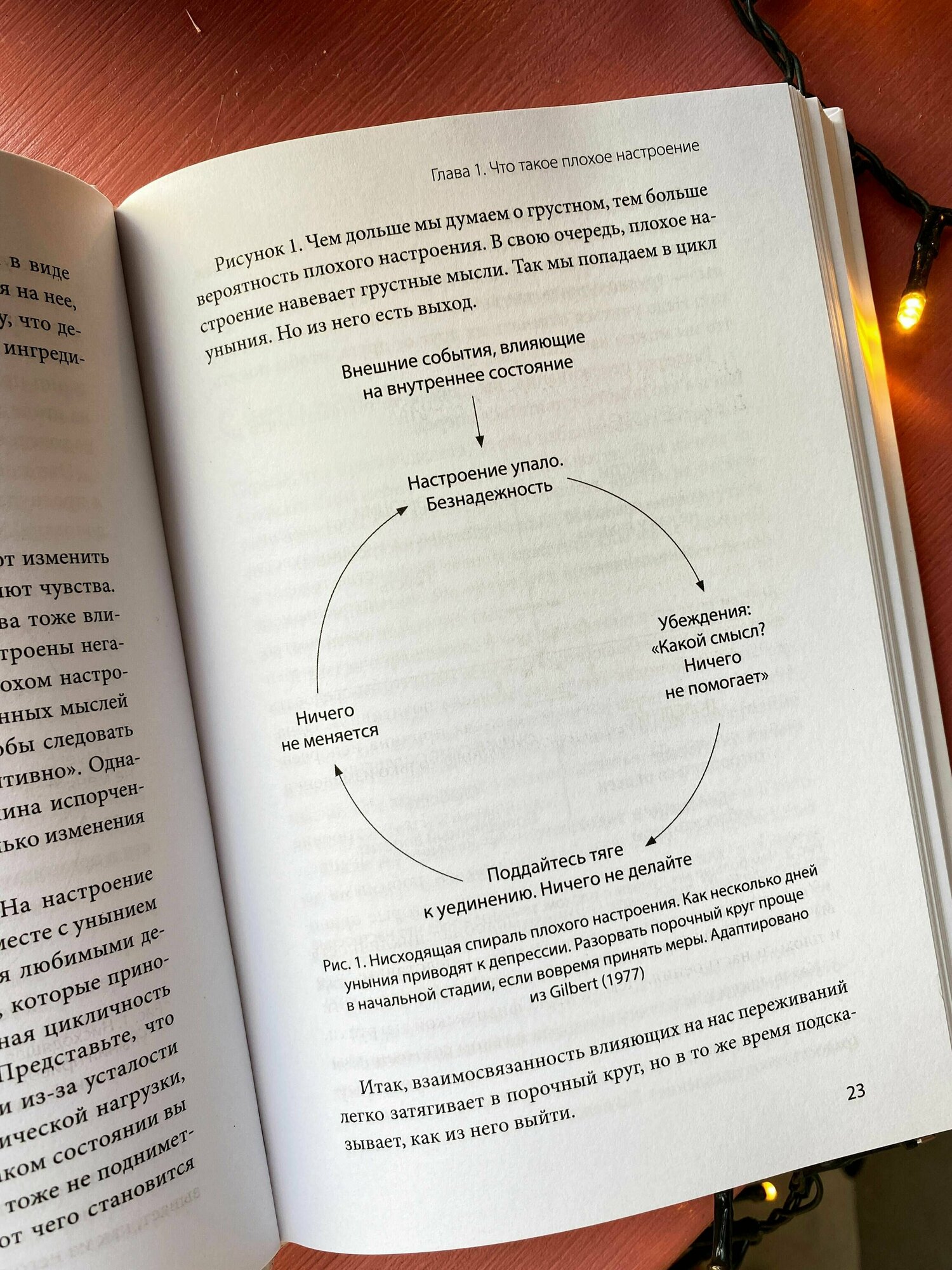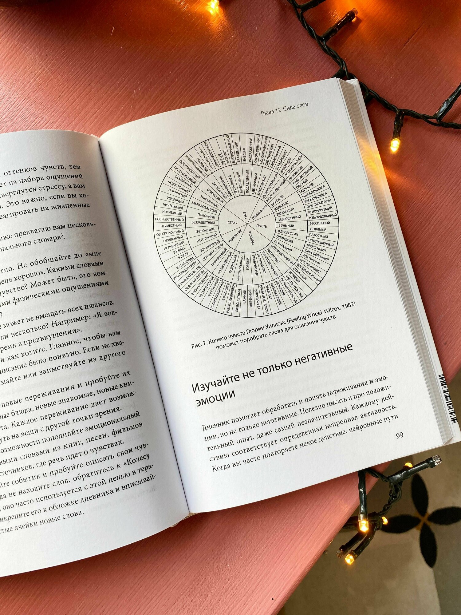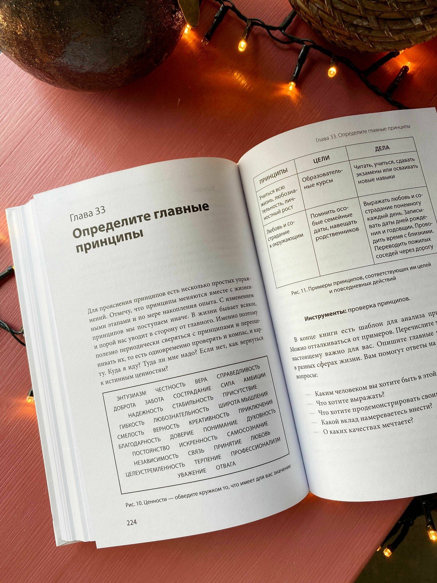 Не обошлось в книге без когнитивных искажений, практик осознанности, благодарности, обсуждения тем мотивации, прокрастинации, целей, привычек, рекомендаций общего характера про сон, спорт, питание, режим дня, общение с другими людьми. В конце есть глава про ценности и отношения. Основная работа – ведение дневника и практики.