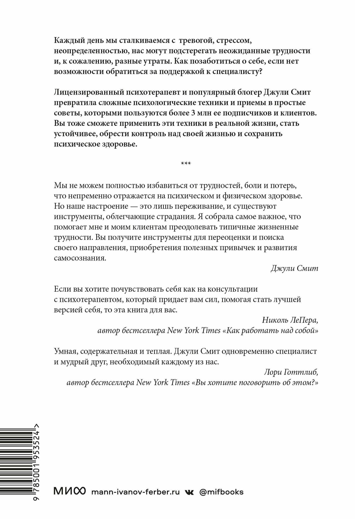 Простые, но квалифицированные советы на каждый день помогут справиться с тревогой, стрессом, горем, неопределенностью, стать устойчивее и в конечном счете взять на себя ответственность за свое психическое здоровье. В книге очень удобная навигация: материал разбит на короткие главы, и читатель сможет сразу обратиться к той теме, которая в данный момент волнует его больше всего — и быстро найти подходящие инструменты.