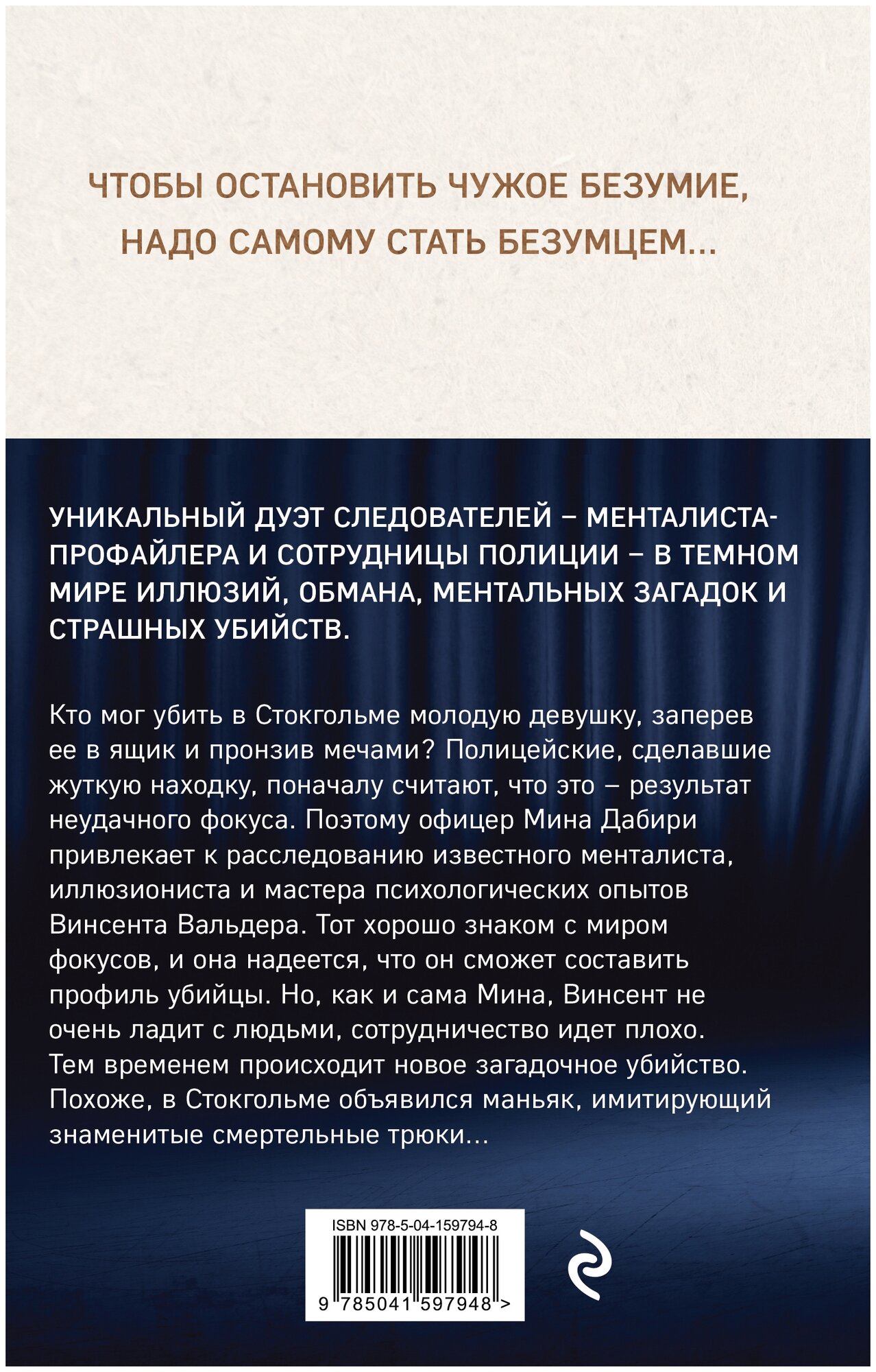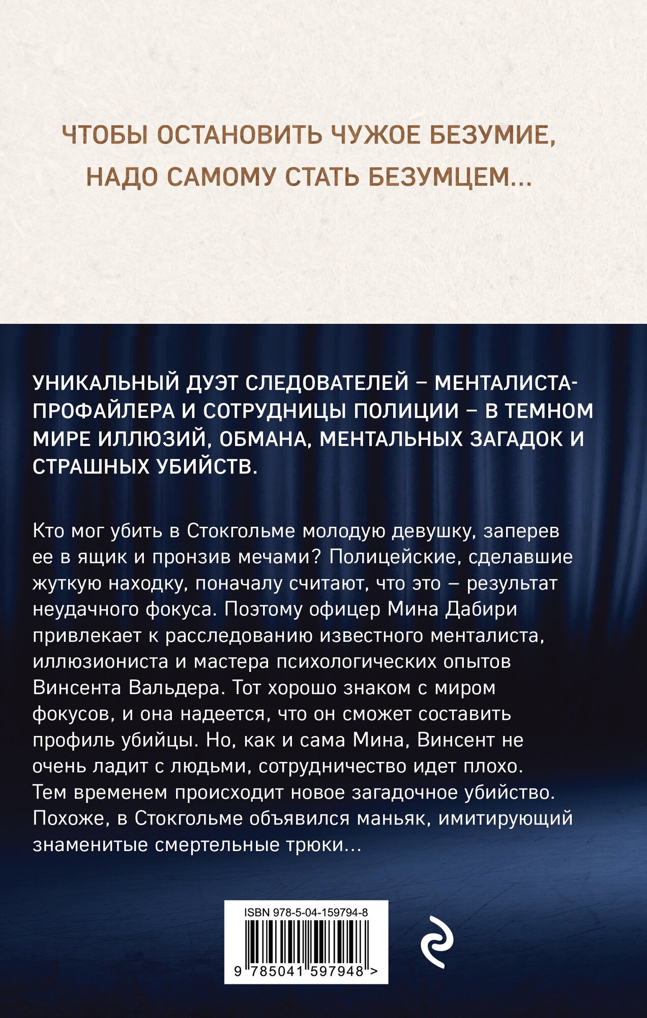 Кто мог убить в Стокгольме молодую девушку, заперев ее в ящик и пронзив мечами? Полицейские, сделавшие жуткую находку, поначалу считают, что это - результат неудачного фокуса. Поэтому офицер Мина Дабири привлекает к расследованию известного менталиста, иллюзиониста и мастера психологических опытов Винсента Вальдера. Тот хорошо знаком с миром фокусов, и она надеется, что он сможет составить профиль убийцы. Но, как и сама Мина, Винсент не очень ладит с людьми, сотрудничество идет плохо. Тем временем, происходит новое загадочное убийство. Похоже, в Стокгольме объявился маньяк, имитирующий знаменитые смертельные трюки…