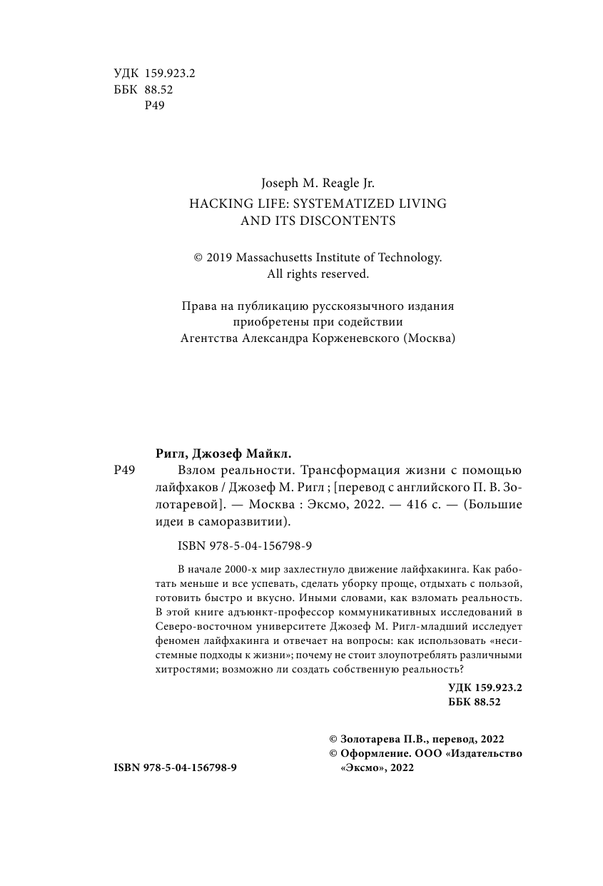 Взлом реальности. Трансформация жизни с помощью лайфхаков (Ригл Джозеф Майкл); ООО "Издательство "Эксмо", 2022