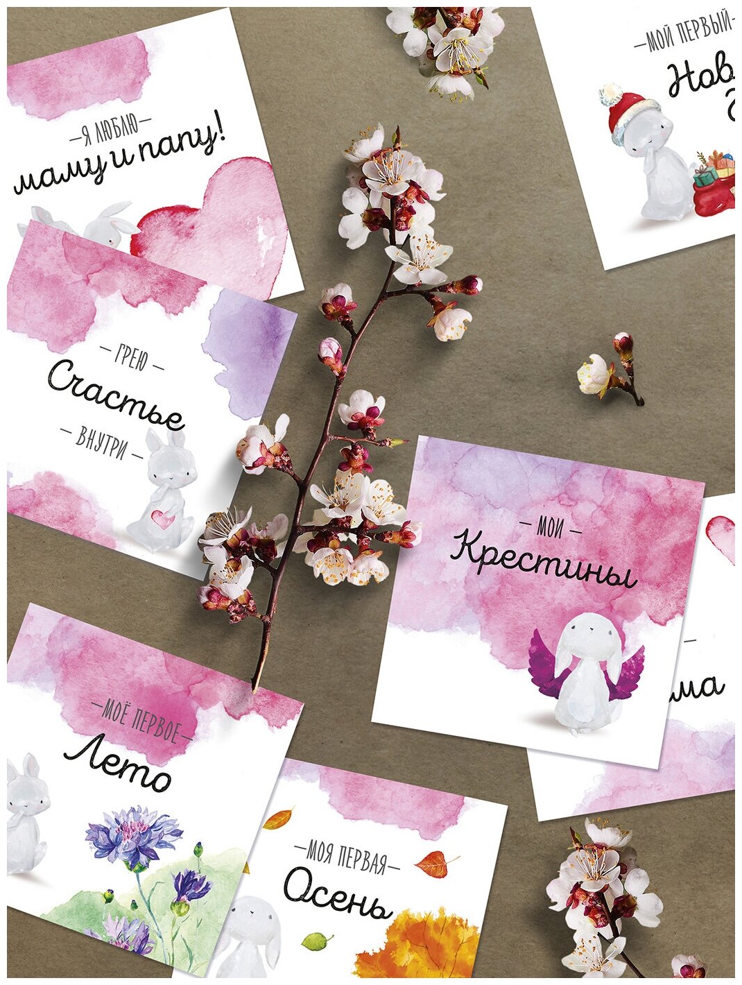 - большой формат, матовое покрытие и нежный дизайн с крупным ярким текстом — карточки не бликуют, а подписи отлично видны на фото.