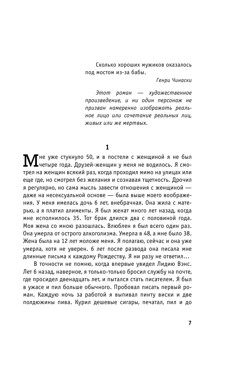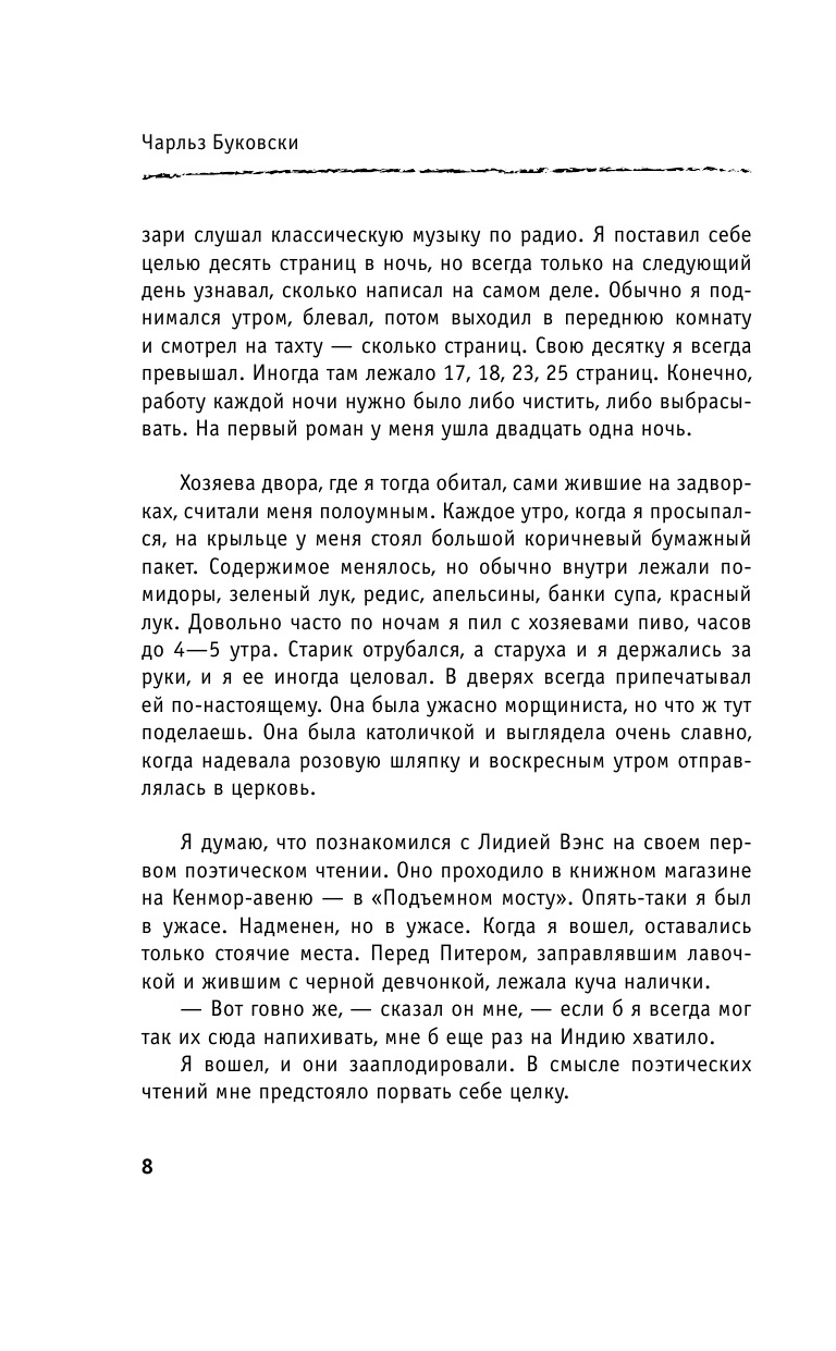 приятно видеть культовое произведение в весьма приличном для «грязного реализма» качестве исполнения… роман представляет собой продолжение истории жизненного пути «антигероя» Генри Чинаски, не забывая при этом о фирменной иронии автора - как над образом жизни «среднего американца», так и над самим собой… хочется также отметить честное оформление обложки - здесь обошлись без аляповатых картинок, ограничившись «зрелой» фотографией писателя… что, в принципе, правильно...