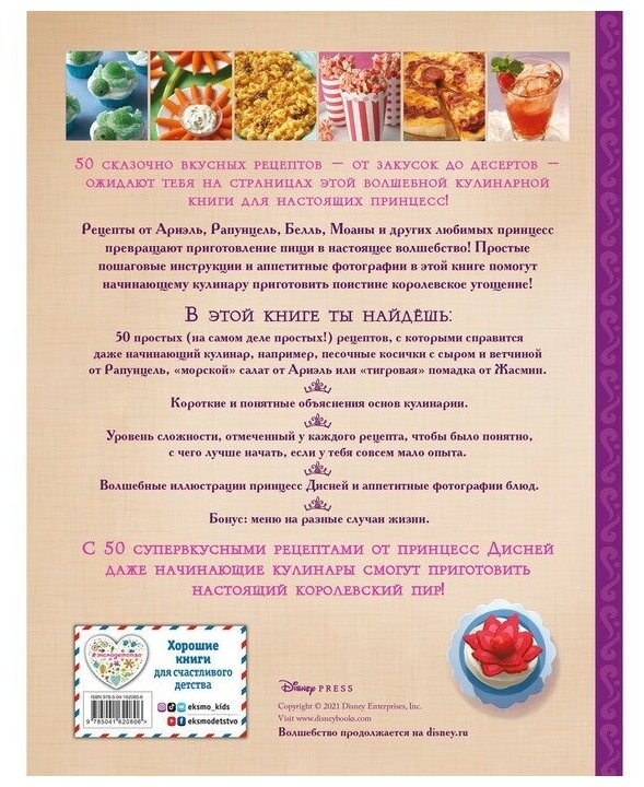Рецепты от Ариэль, Рапунцель, Белль, Моаны и других любимых принцесс превращают приготовление пищи в настоящее волшебство! Простые пошаговые инструкции и аппетитные фотографии в этой книге помогут начинающему кулинару приготовить поистине королевское угощение!