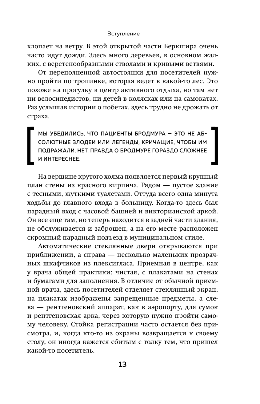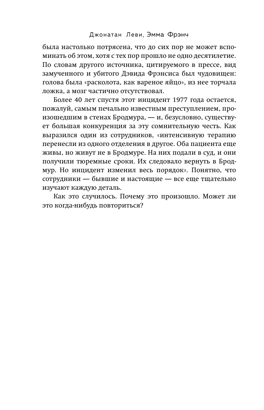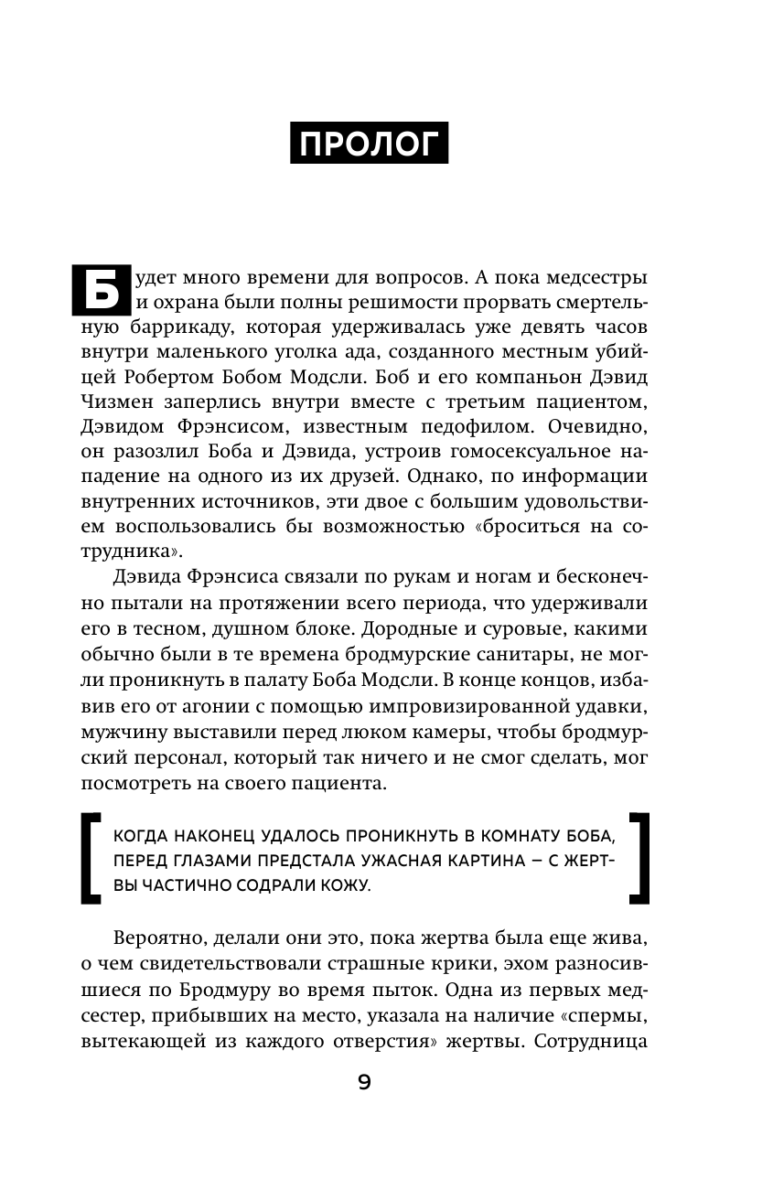 Ожидала от этой книги захватывающего камерного погружения в стены больницы для особо опасных психически больных преступников Великобритании. Всем известный, зловещий и загадочный Бродмур. По итогу книга написана как статья - комментарий к телесериалу, читать и воспринимать её крайне сложно. Отвратительный перевод, как будто школьник делал, настолько же коряво, криво, косо и неудобно это читать. Мозг просто взрывается от подобного текста. Понимаю, что и оригинальное написание видимо в таком духе сделано и над переводом не сильно думали. Итог: к огромному сожалению, читать книгу просто невозможно физически. Текст воспринимается как обрывки смыслов и бесконечных повторений, никакой целостности, никакой идеи, никакой мысленной нити, никакой повествовательной ноты. Ни погружения, ни атмосферы, ни соприкосновения с темой. Всё вокруг да около. Из пустого в порожнее. Обрывки, скачки, ощущение плохой документалки, после которой так и нет никакого понимания предмета обсуждения и никакого мнения о нём.