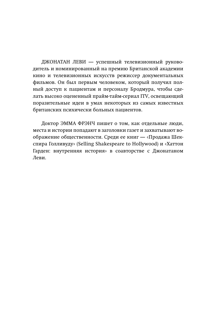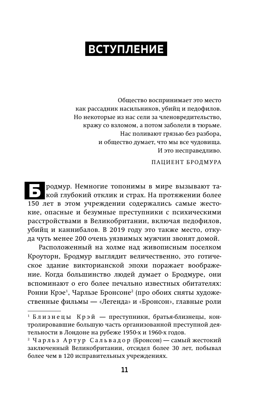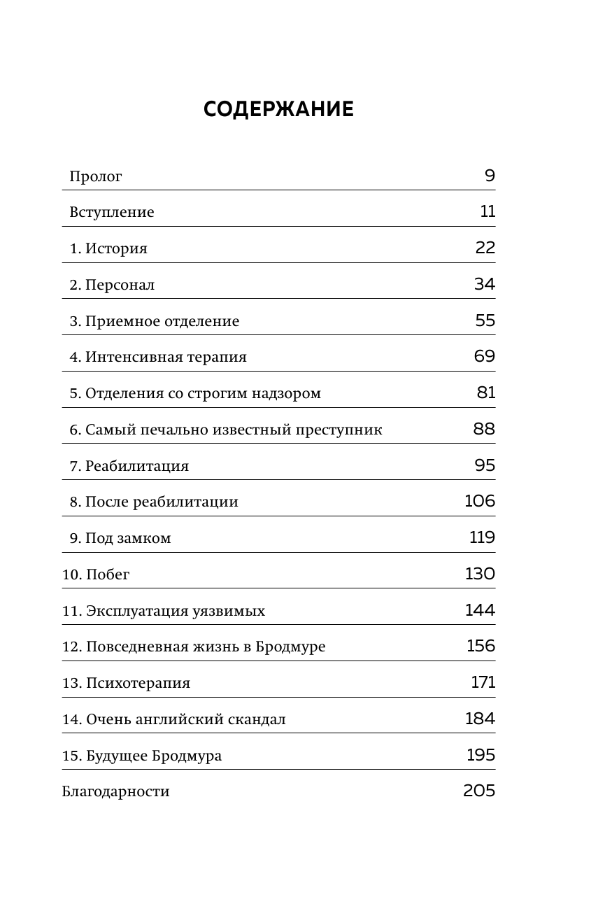 Ожидала от этой книги захватывающего камерного погружения в стены больницы для особо опасных психически больных преступников Великобритании. Всем известный, зловещий и загадочный Бродмур. По итогу книга написана как статья - комментарий к телесериалу, читать и воспринимать её крайне сложно. Отвратительный перевод, как будто школьник делал, настолько же коряво, криво, косо и неудобно это читать. Мозг просто взрывается от подобного текста. Понимаю, что и оригинальное написание видимо в таком духе сделано и над переводом не сильно думали. Итог: к огромному сожалению, читать книгу просто невозможно физически. Текст воспринимается как обрывки смыслов и бесконечных повторений, никакой целостности, никакой идеи, никакой мысленной нити, никакой повествовательной ноты. Ни погружения, ни атмосферы, ни соприкосновения с темой. Всё вокруг да около. Из пустого в порожнее. Обрывки, скачки, ощущение плохой документалки, после которой так и нет никакого понимания предмета обсуждения и никакого мнения о нём.