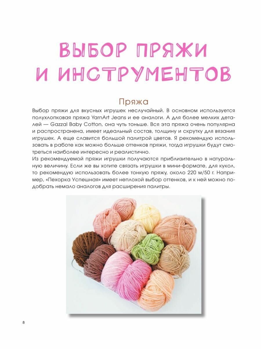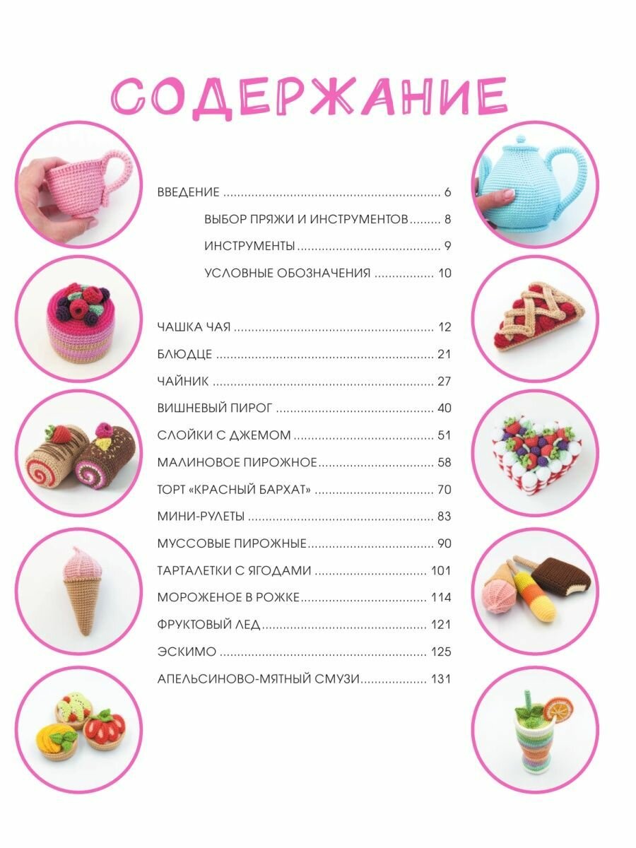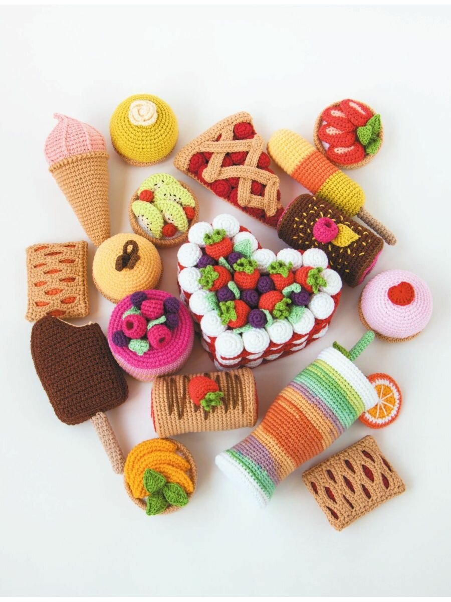 В книге представлены очень вкусные игрушки: пирожные, мороженое, корзиночки, торт, коктейль. Также там есть даже блюдце с чайничком. Отличные игрушки для вязания детям, на подарок или чтобы просто создать уют в доме. Хочется связать всё. Очень красивые иллюстрации, понятые описания, должен справиться даже новичок в вязании. В приобретении книжки не пожалела, отличное дополнение в вязальную библиотеку, которое не просто будет стоять на полке, а будет использовано по назначению.