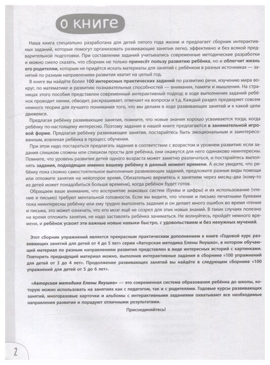 100 УПРАЖНЕНИЙ для детей от 4 до 5 лет – это сборник интерактивных заданий, которые помогут организовать развивающие занятия легко, эффективно, и без всякой предварительной подготовки. Сборник является современной методической разработкой и не только принесет пользу развитию ребенка, но и облегчит жизнь его родителям, которым не придется искать материалы для занятий с ребенком в разных источниках – занятий по разным направлениям развития хватит на целый год.