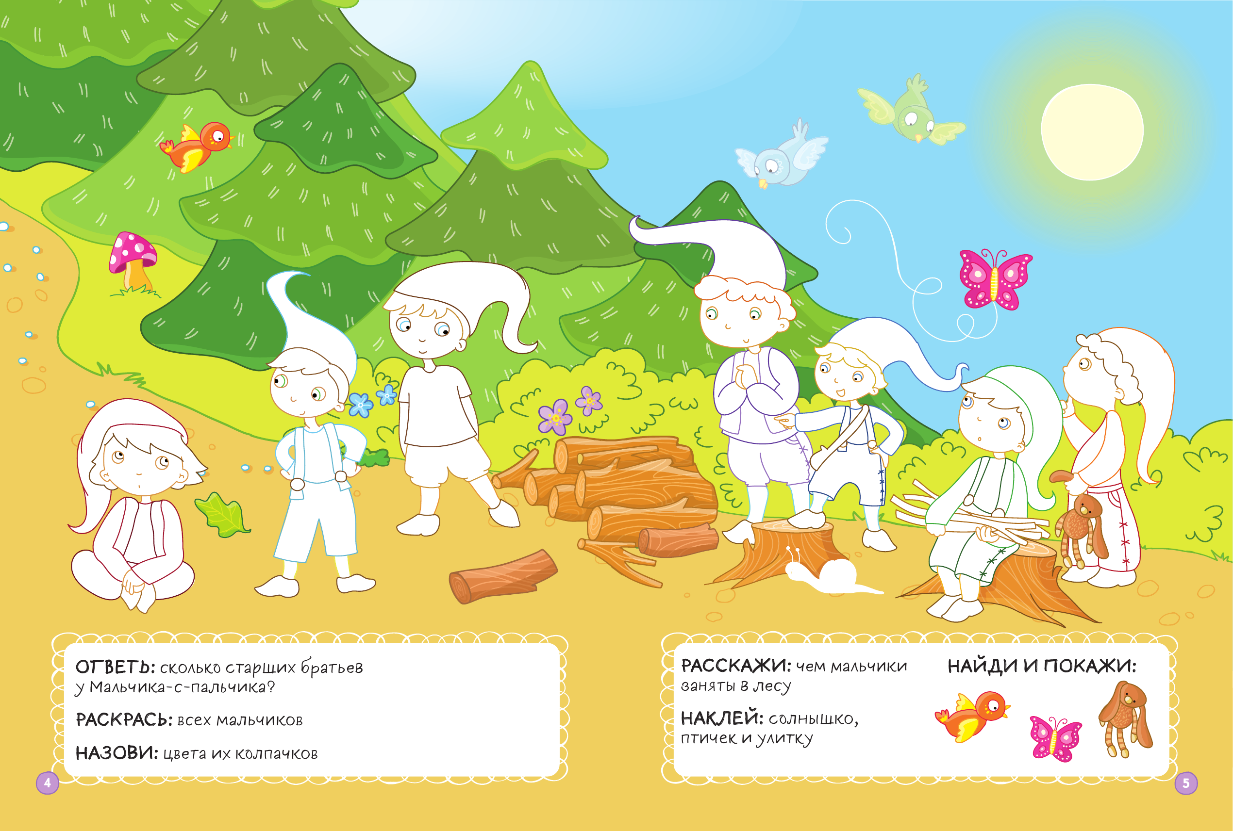 Для детей от 3-х лет, кто знаком со сказкой «Мальчик-с-пальчик» и хорошо в ней ориентируется. Потому что там есть вопросики по содержанию. А так в принципе и раскрашивать, и выполнять разные задания (поиск отличий, лабиринт и тп) можно выполнять и без чтения этой сказки. + 2 страницы наклеек.