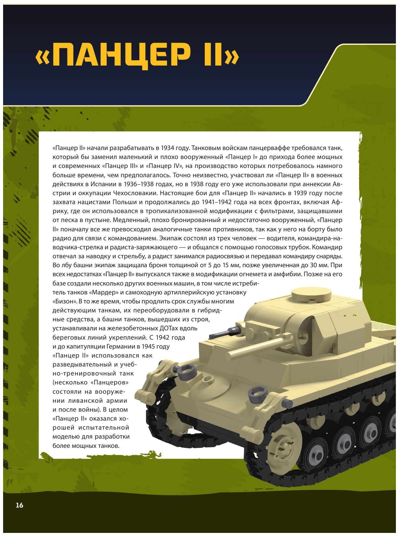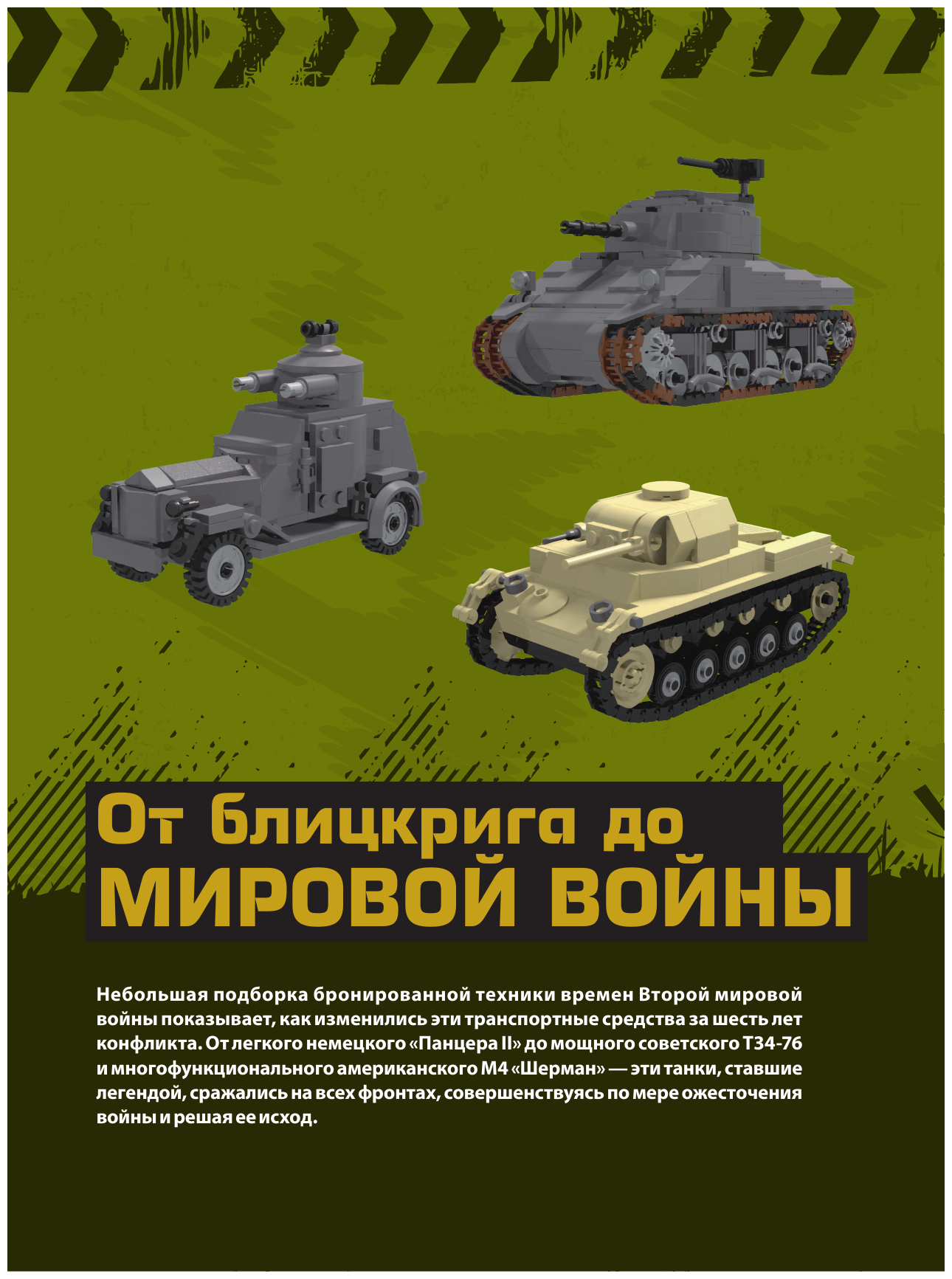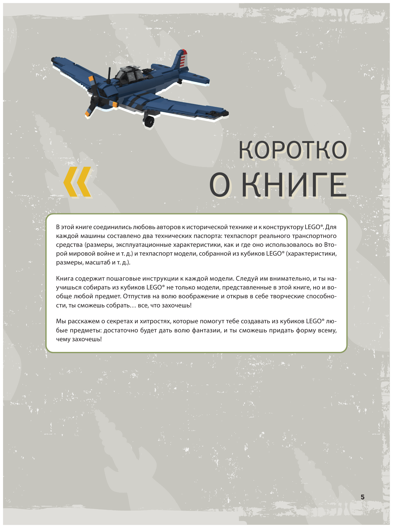Для мальчиков - это один из самых интересных и занимательных подарков, поэтому когда с мужем увидели эту книгу, то поняли, что сын точно оценит такое. В этой книге для каждой машины составлено два технических паспорта: первый - это техпаспорт реального транспортного средства, в нем подробно описываются размеры, характеристики, как и где оно использовалось во Второй мировой войне, а второй, техпаспорт модели, собранной из кубиков. В общем, любители военной техники и истории обязательно оценят такую книгу.
