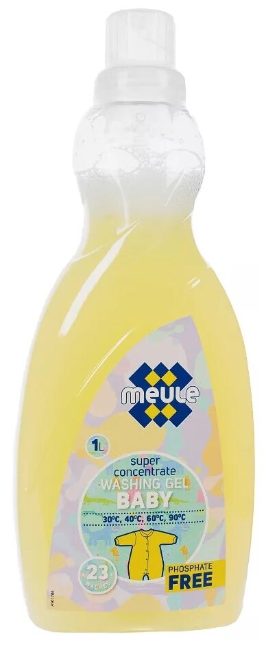 Meule Baby гипоаллергенный. Рекомендован с первых дней жизни ребенка от 0 месяцев. Подходит для людей с чувствительной кожей, не вызывает аллергии. Для всех типов ткани, включая шерсть. Для белого и цветного белья, обновляет цвет и сохраняет структуру ткани. Удаляет пятна (молоко, детское питание, каши, пюре, сок и т. д.) Великолепно отстирывает пеленки. Предупреждает образование накипи на водонагревательном элементе. Работает в широком диапазоне температур (30С-90С). Рекомендован для машинной и ручной стирки. Полностью выполаскивается.