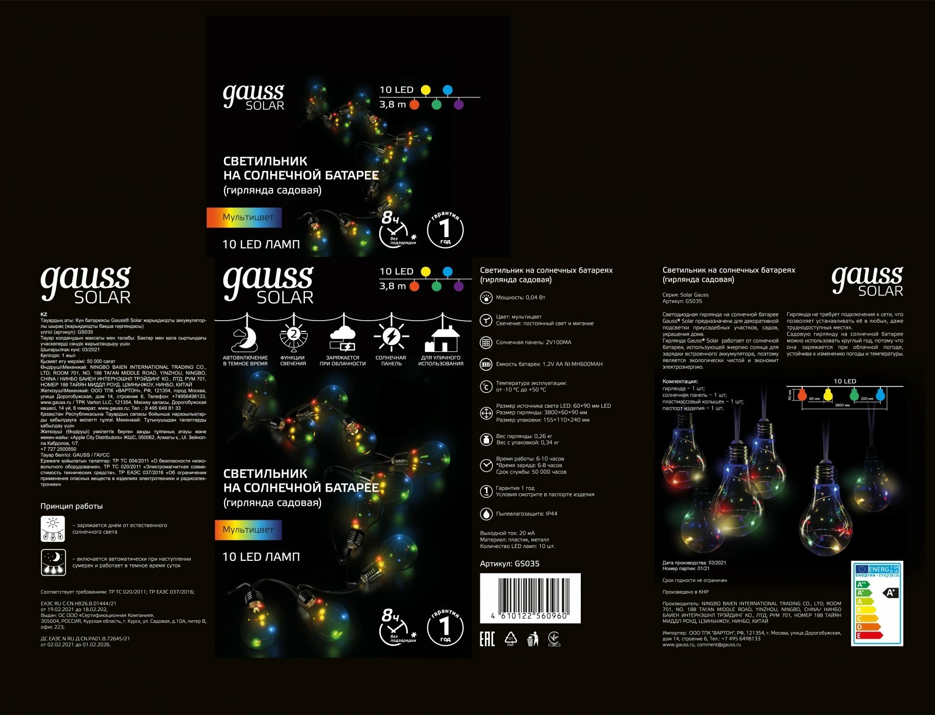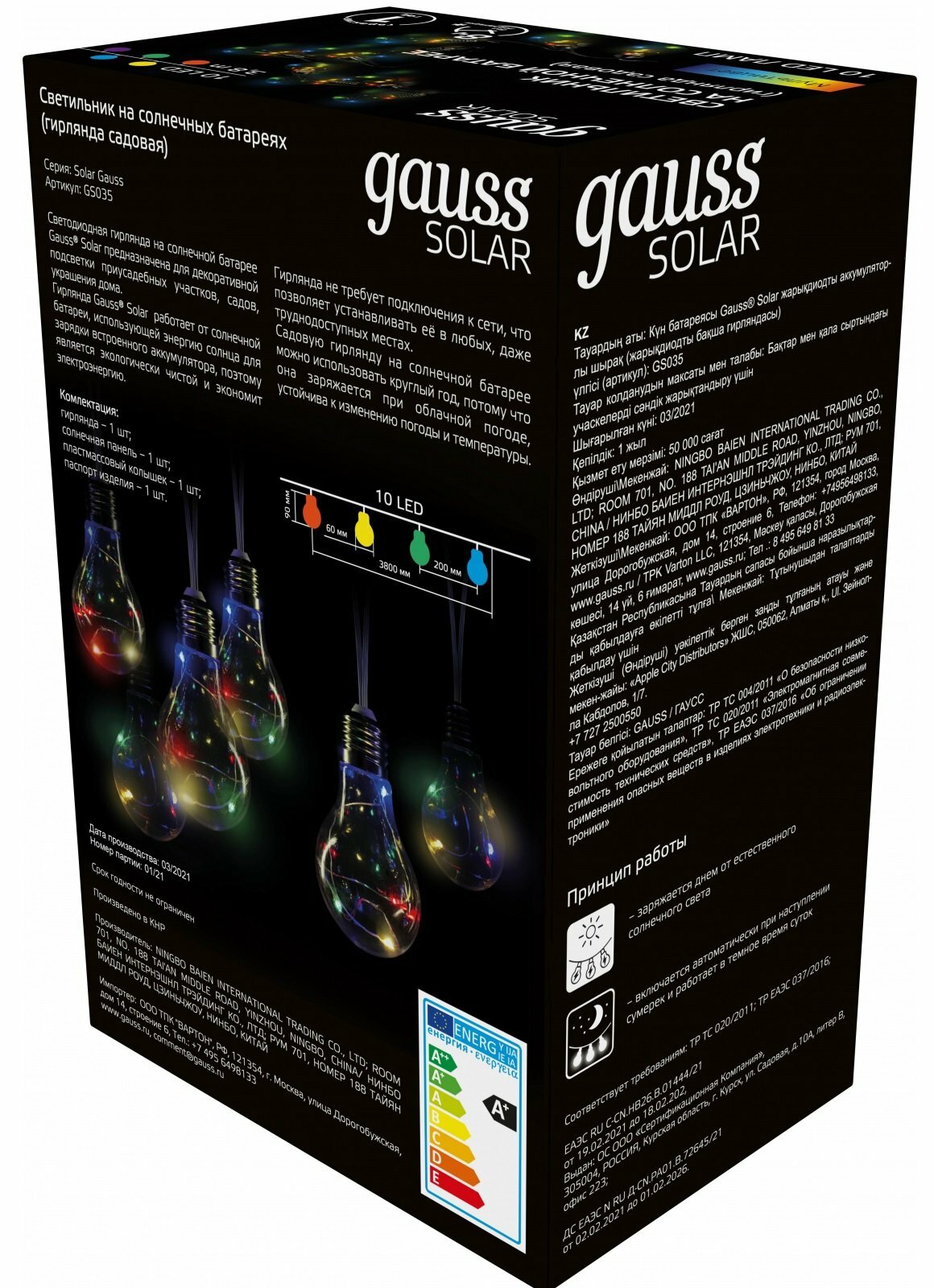 | Комплектация | Гирлянда, солнечная панель, пластмассовый колышек, паспорт изделия. |