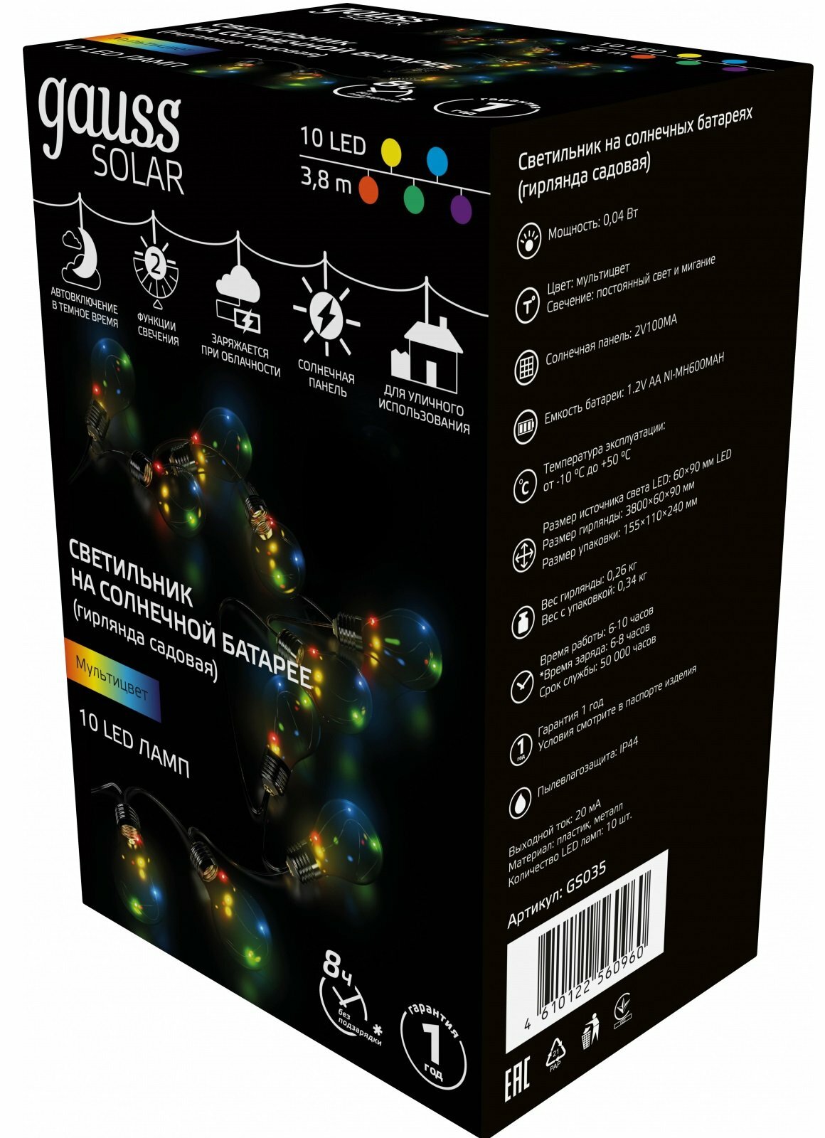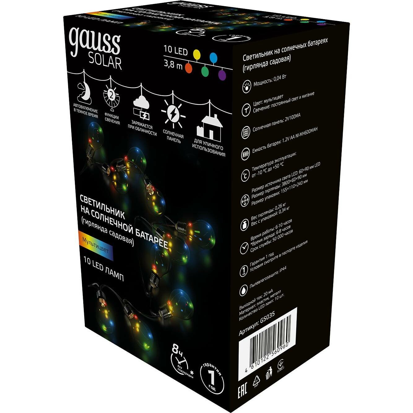 Садовая гирлянда Gauss на солнечной батарее с 10 лампами в комплекте — это классическое декоративное освещение для дачных участков и открытых парковых территорий. Такое освещение подойдет для подсветки между деревьями или фасада дома. Для подключения сеть не требуется, так как гирлянда работает на солнечной батарее. А за счет степени пылевлагозащиты IP44 садовая гирлянды будет работать во время дождя.