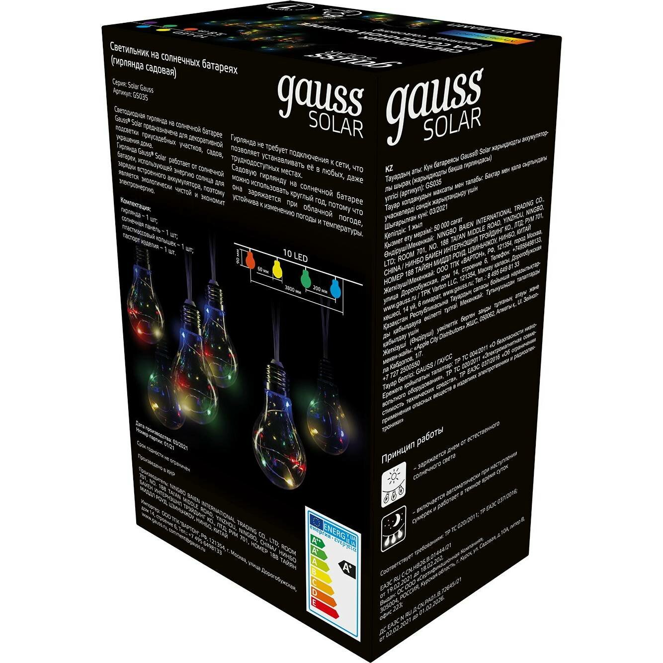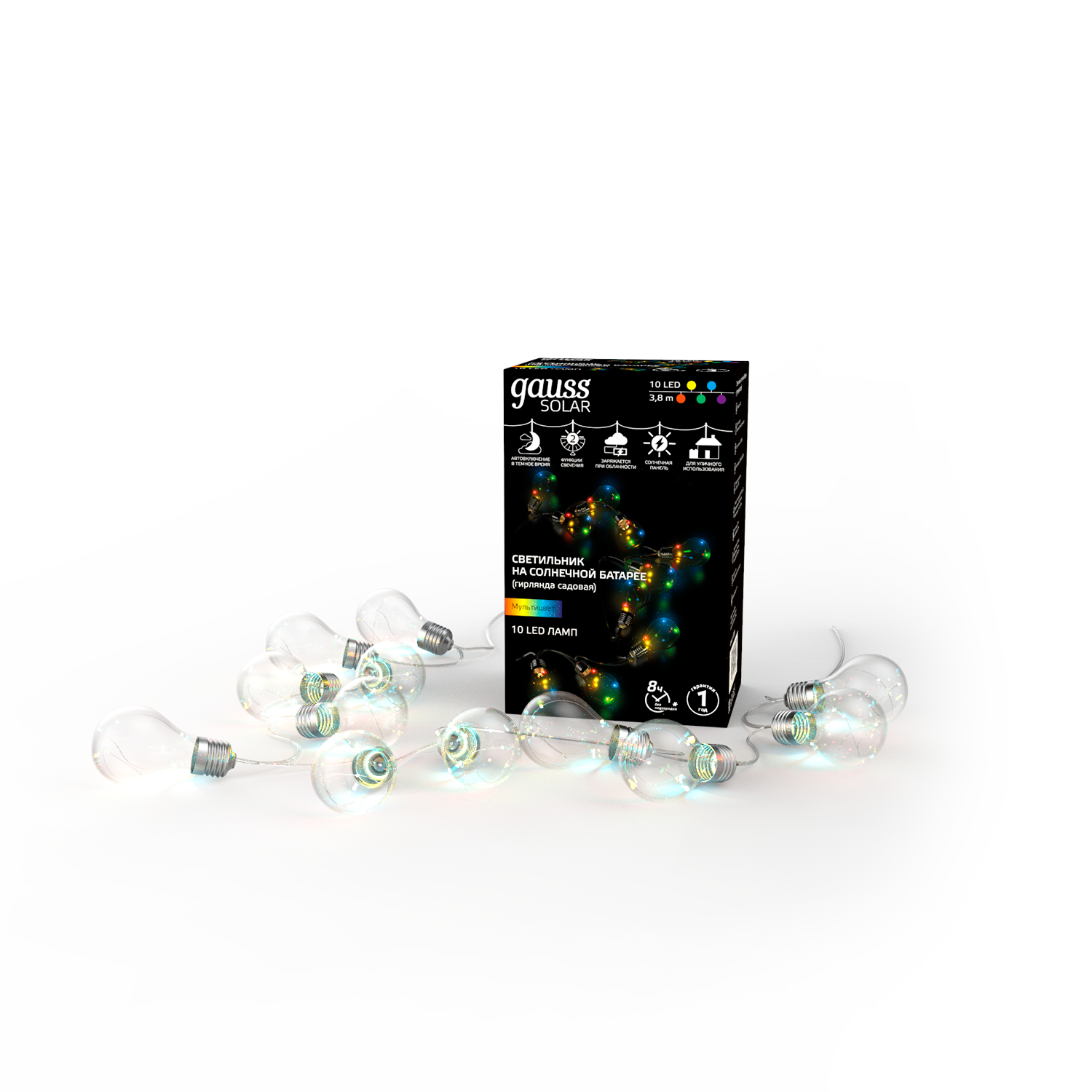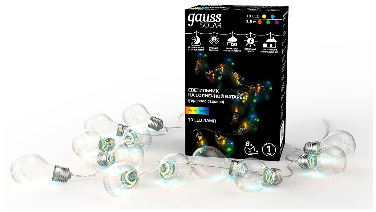 Гирлянда садовая на солнечной батарее 10 LED ламп Большие Шары мультицвет Gauss Solar 1/