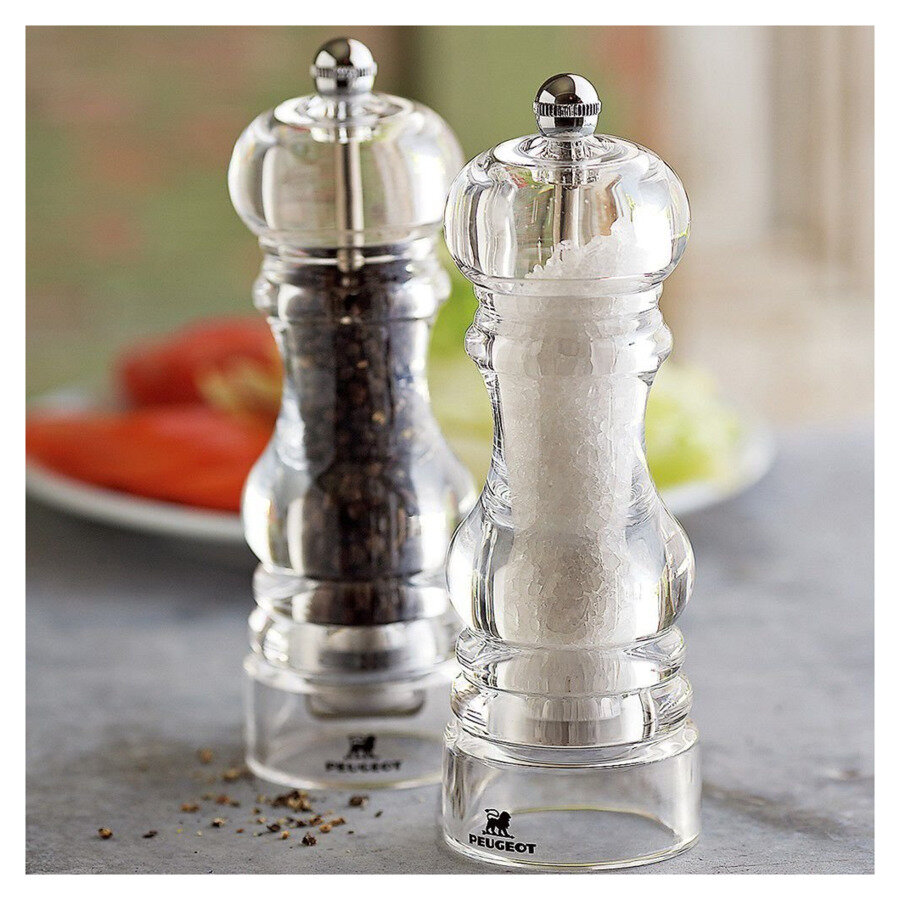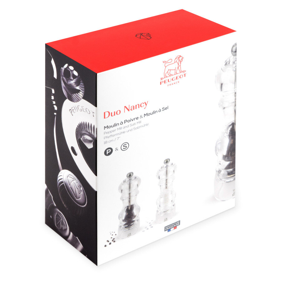 Набор мельниц для соли и перца Peugeot "Nancy" выполнен из прочного прозрачного акрила. Механизм для измельчения перца оснащен двойным рядом винтообразных зубцов для захвата горошин и подачи их к основанию, а затем удержания их до безупречного помола. Эта уникальная система позволяет регулировать уровень помола. Механизм для измельчения крупной белой соли позволяет измельчить кристаллы соли до такой степени, чтобы блюдо было совершенным. Выполнен из нержавеющей стали и имеет антикоррозионное покрытие.