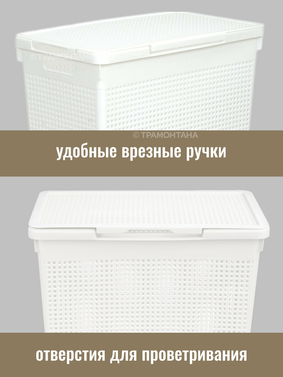 Корзина для белья идеально впишется в интерьер ванной комнаты или гардеробной. Габариты корзины позволяют поставить ее в узком пространстве между стеной и стиральной машиной, оптимальна для использования даже в небольших помещениях. Изделие имеет ручки с двух сторон для удобства использования и переноски. Матовая поверхность с квадратными сквозными отверстиями смотрится стильно и минималистично, делает корзины легкими и проветриваемыми. Благодаря специальной конструкции крышки, ее можно открывать как с торцевой, так и с фронтальной стороны корзины, в зависимости от места размещения.