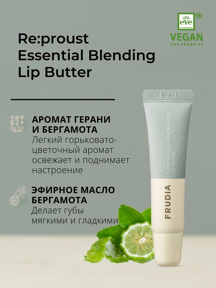 | Полное наименование | Смягчающий баттер для губ с маслами герани и бергамота Сила растений, 10 г, Frudia |