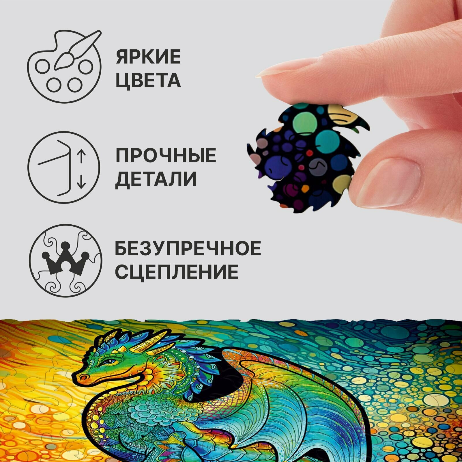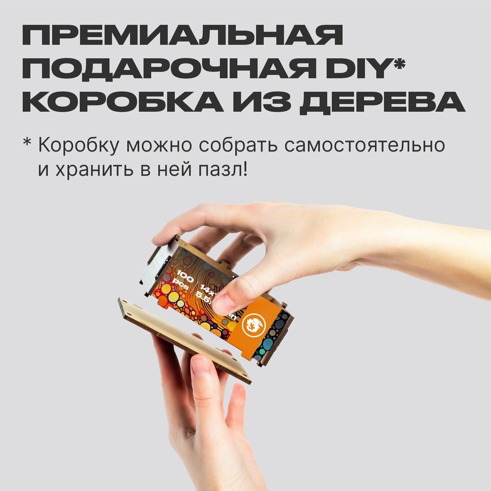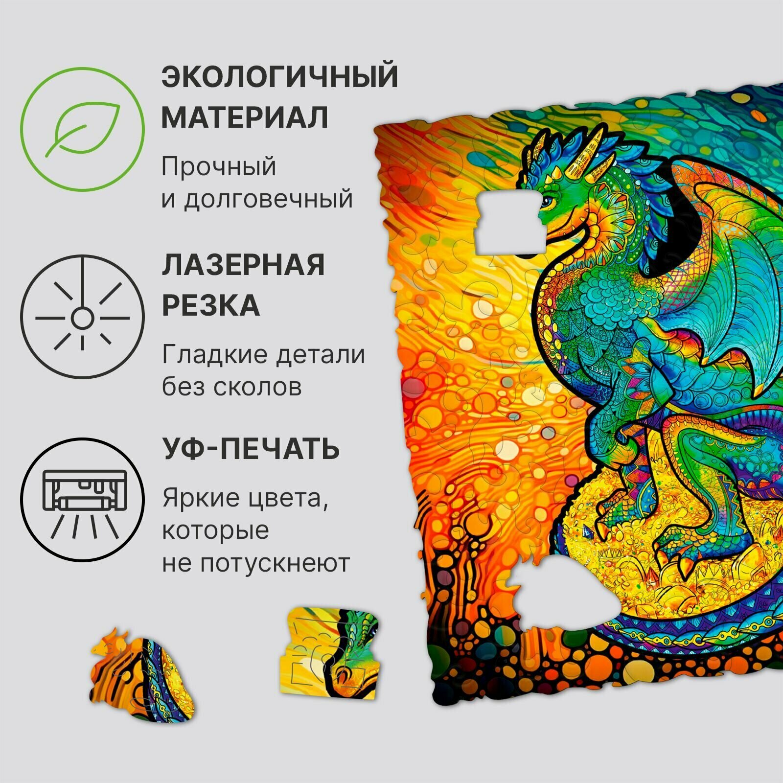 Сам пазл выполнен из ХДФ, с применением высокоточного лазера. Благодаря этому все детали идеально подходят друг к другу. Каждый кусочек приятно держать в руках и ощущать слегка уловимый аромат дерева.