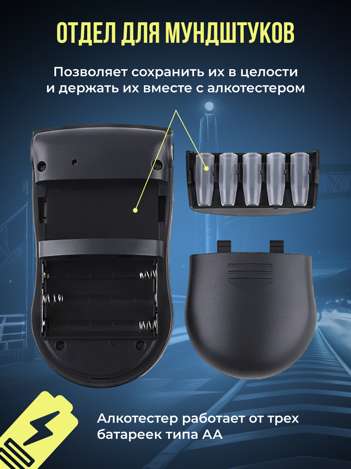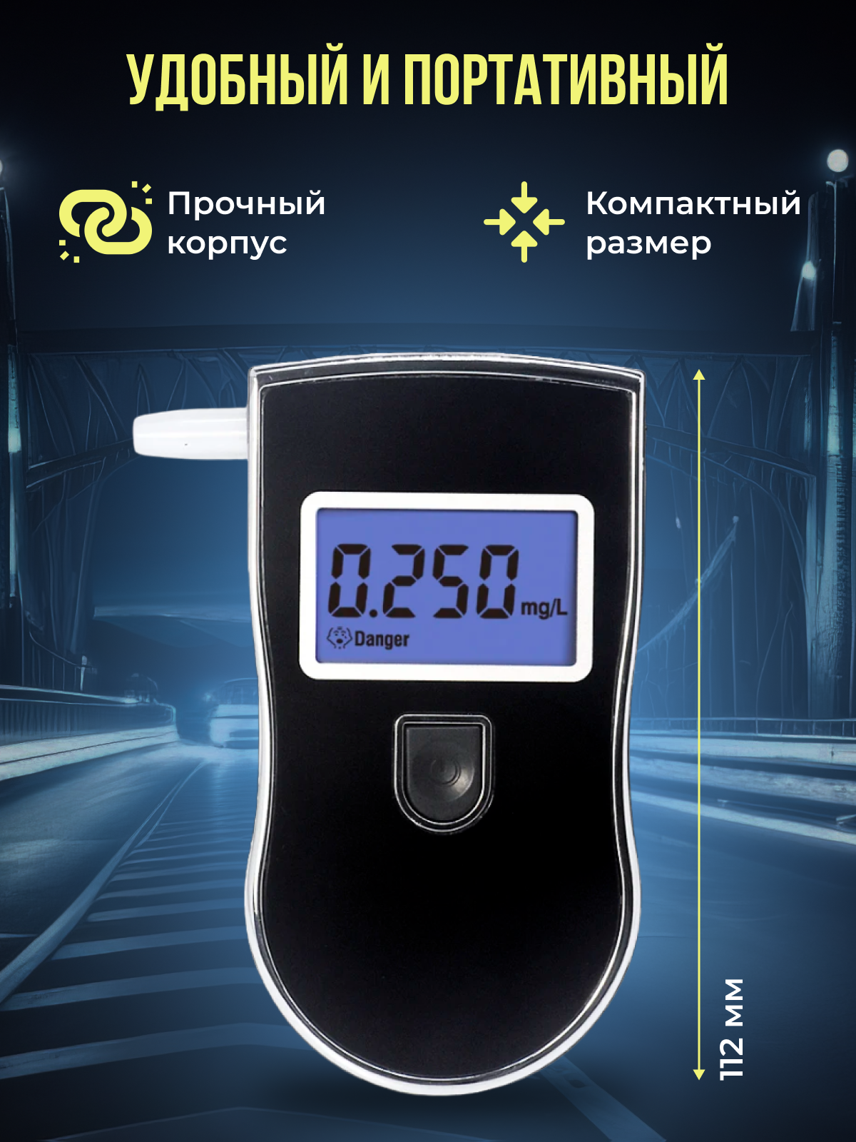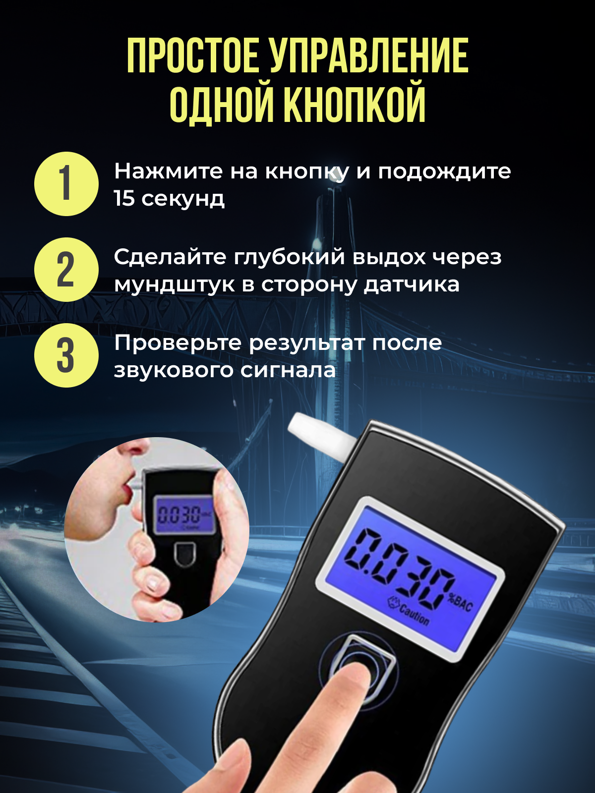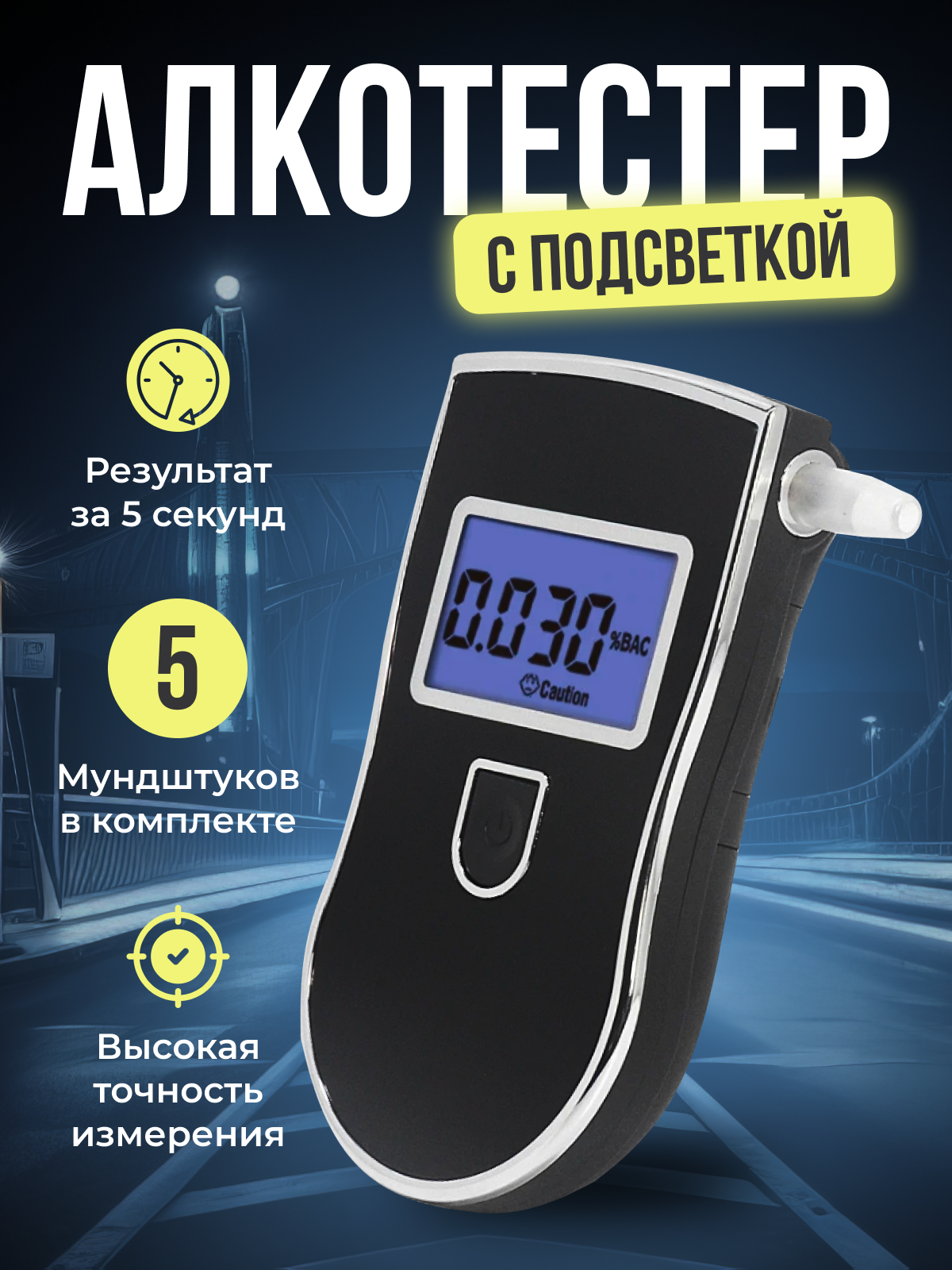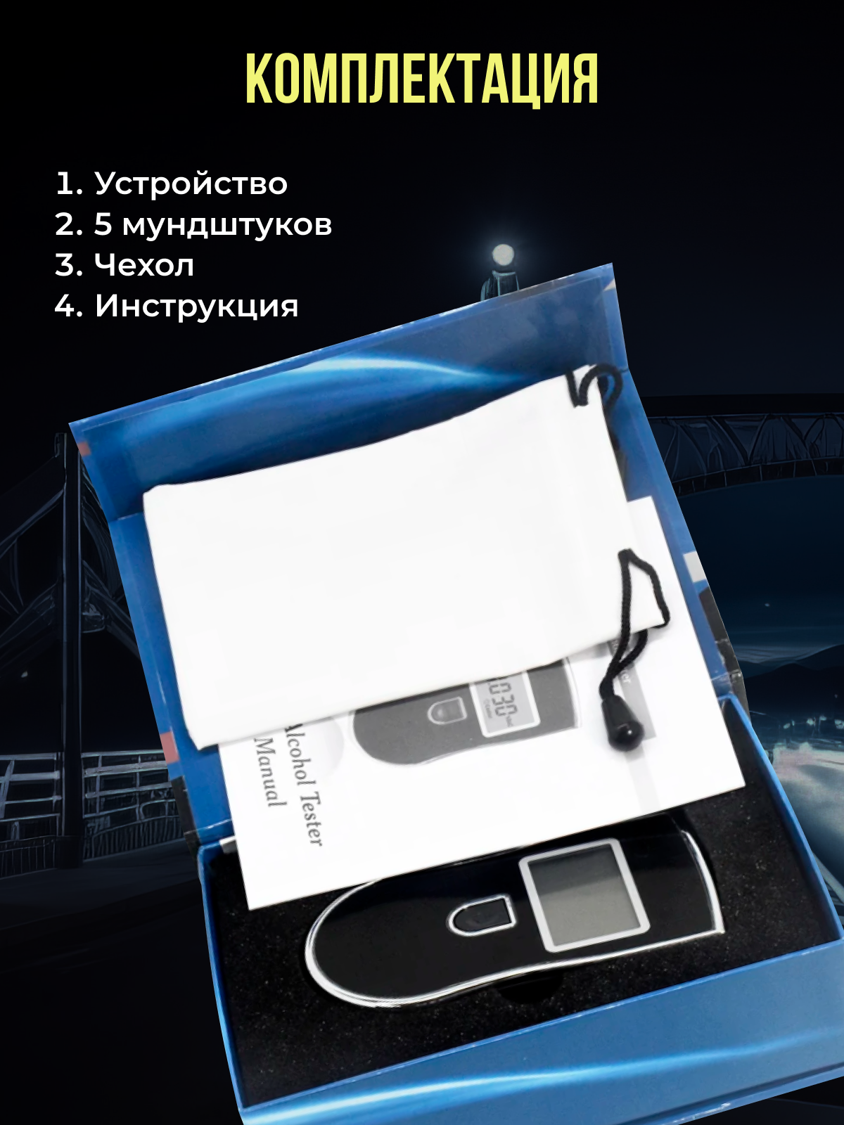 Алкотестер модели АТ-pro поможет быстро и точно определить уровень этанола в выдыхаемом воздухе. Персональный аналог тестера на алкоголь, который используют сотрудники ГИБДД появился лишь недавно. Сегодня он облегчает жизнь тысячам людей во многих ситуациях: оценить риски перед вождением автомобиля, удостовериться в свежести дыхания перед свиданием или важной встречей. Внешний вид этой модели алкотестера также очень стильный: глянцевая поверхность, хромированная обводка, ЖК-дисплей с подсветкой. Так что профессиональный алкотестер АТ-300 станет прекрасным, нестандартным решением для подарка мужчине. В комплекте будет всё, что необходимо: батарейки, пять сменных насадок, инструкция на русском языке. Также мы подарим стильный мешочек для хранения, сделанный из плотной белой ткани. Устройство будет упаковано в брендированную коробку с жестким корпусом и магнитной крышкой.КомплектацияТолько в нашем магазине вы сможете приобрести алкотестер в полной комплектации, ничего не докупая и с возможностью использовать сразу. Устройство работает от трех щелочных батареек ААА (мизинчиковая батарейка), которые уже будут помещены внутрь. Пять насадок (мундштуков) удобно хранятся в специальном отсеке внутри корпуса, что очень практично – для них не требуется отдельное место, при этом можно использовать сразу для нескольких человек. Мундштуки легко промываются водой для последующего использования. Алкотестер прост и интуитивно понятен в использования, однако краткая инструкция на русском языке предусмотрена в комплекте.ИспользованиеПеред измерением алкоголя в крови извлеките насадку из задней части корпуса и вставьте ее в специальное боковое отверстие. Затем нажмите кнопку включения и подождите пока прибор нагреется и проведет самотестирование. Это займет не более 15 секунд. Затем на ЖК дисплее алкотестера появится надпись BLOW («дышите») и начнется обратный отсчет 10 секунд, в течение которых электрохимический сенсор алкотестера будет измерять пары этанола в воздухе. Вам необходимо плавно в течение 3-4 секунд дуть в мундштук. Уже скоро результат появится на экране сразу в трех единицах измерения. Для того, чтобы переключаться между ними, нажимайте и удерживайте кнопку включения. Примерно через 20 секунд после демонстрации результатов прибор автоматически выключится. Рекомендуется выдержать интервал 3 минуты между измерениями для того, чтобы нагревательный датчик алкотестера успевал остыть не перегружался.