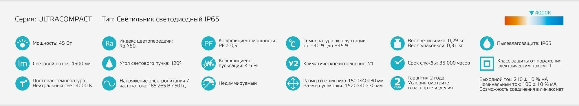 Модель: линейный LED Ultracompact 45W 4500lm 4000K 185-265V IP65 1490х40х30 мм