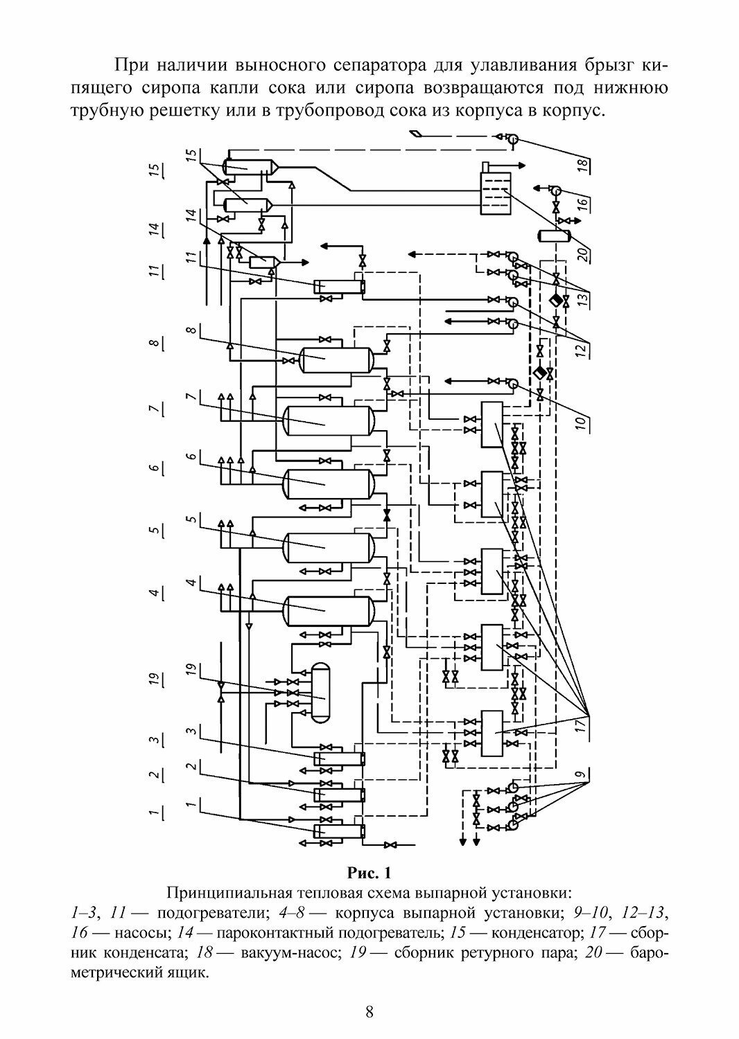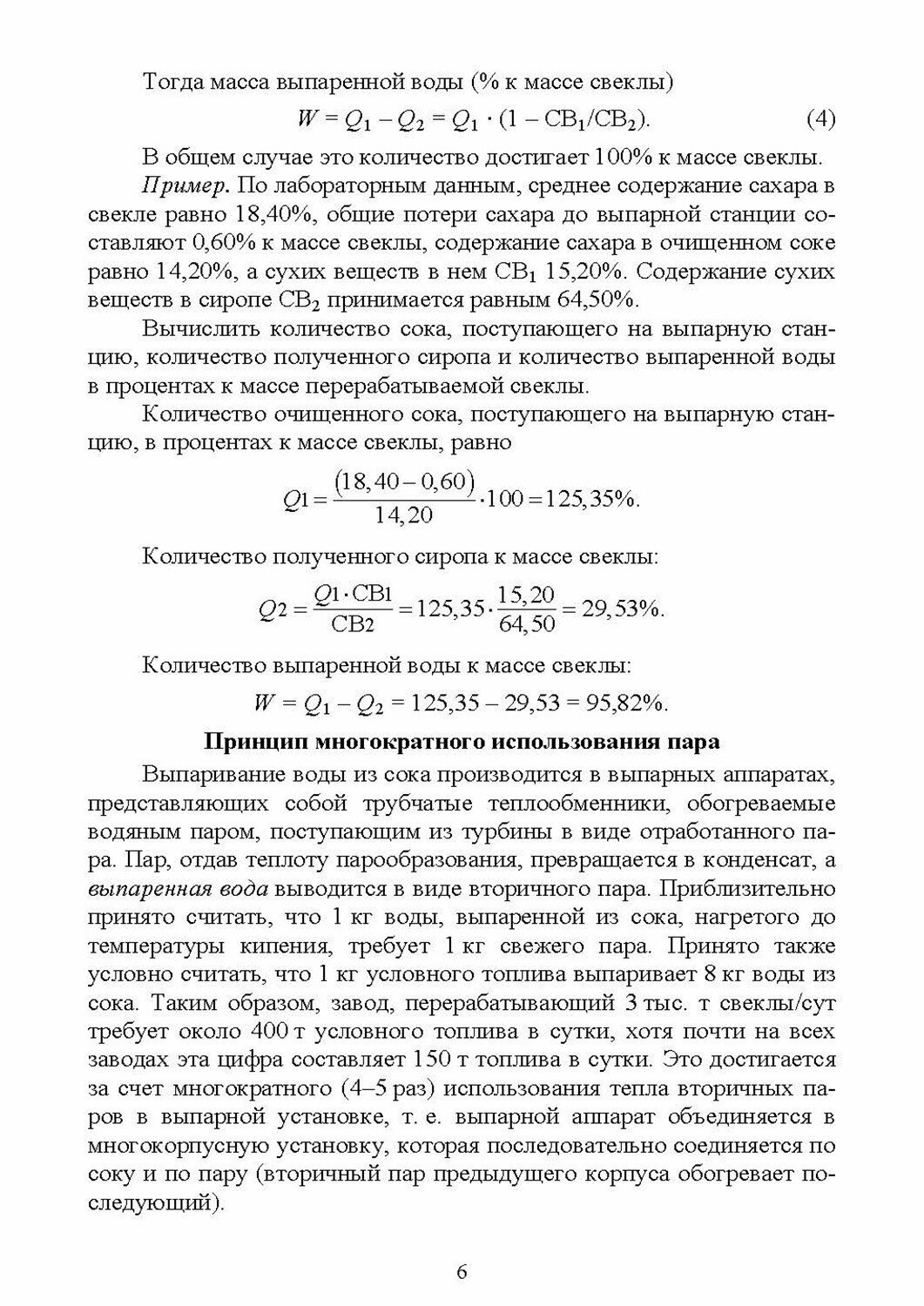 Рассмотрены технологическая схема выпарной установки, химические изменения, происходящие в соке при выпаривании, особенности схем выпарных установок, режимы, применение ингибиторов накипеобразования при сгущении сока, а также современные выпарные аппараты и подогреватели, дан пример расчета задач для типовой технологической схемы.