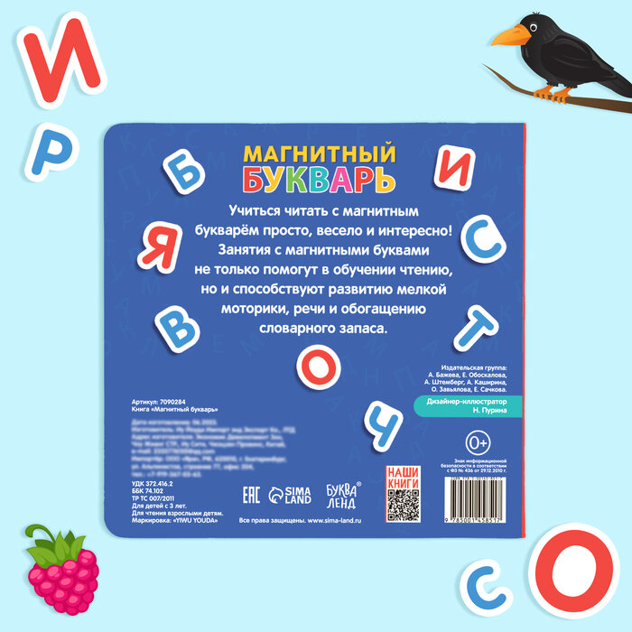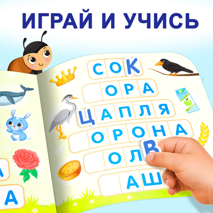 Внутри вы найдёте 60 магнитов, с которыми малыш сможет выучить алфавит и научится составлять слова.