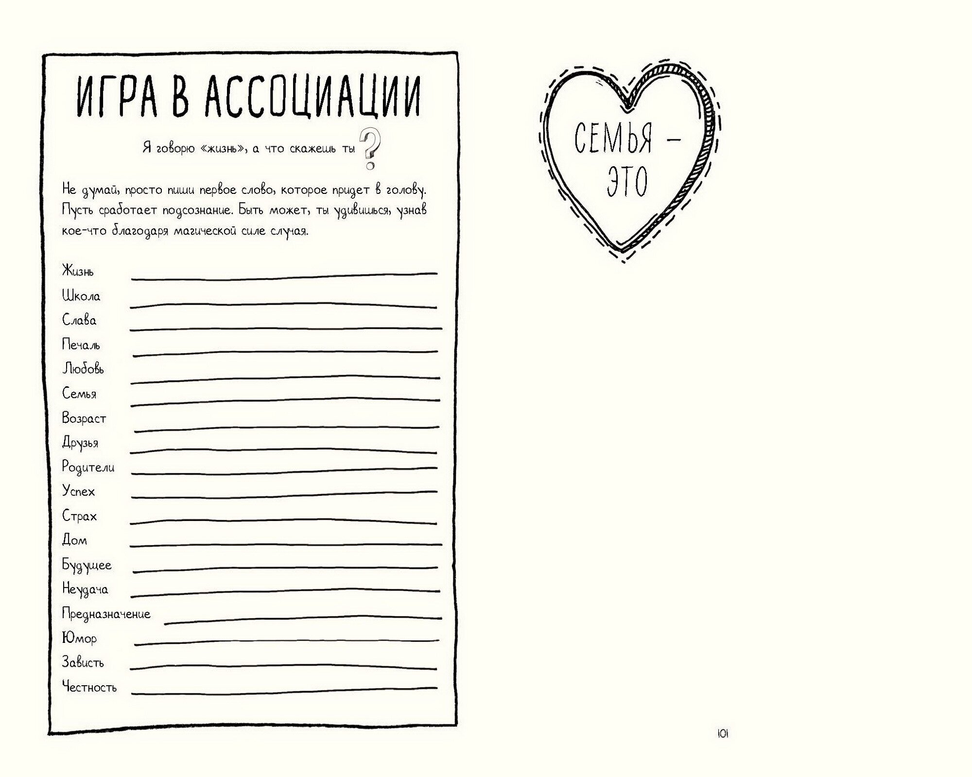 Одни вопросы забавные, другие - глубокие и заставляют задуматься, а третьи - случайные. Подходи к ответам смело и творчески! Ты можешь отнестись к заполнению блокнота со всей серьезностью, а можешь просто повеселиться, или и то, и другое. Решать тебе!