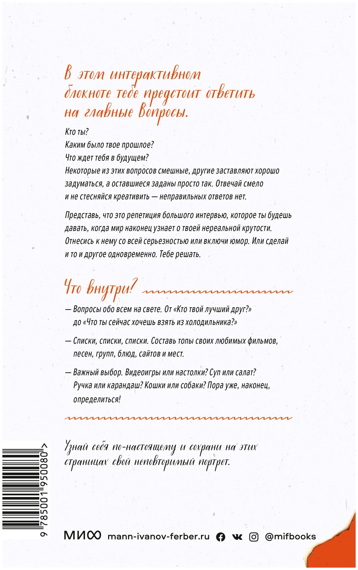 Рассматривай это как репетицию перед большим интервью, которое тебе точно придется давать, когда мир наконец поймет, насколько ты удивительный! На этих страницах ты запечатлеешь себя таким, какой ты есть сейчас и каким больше никогда не будешь!