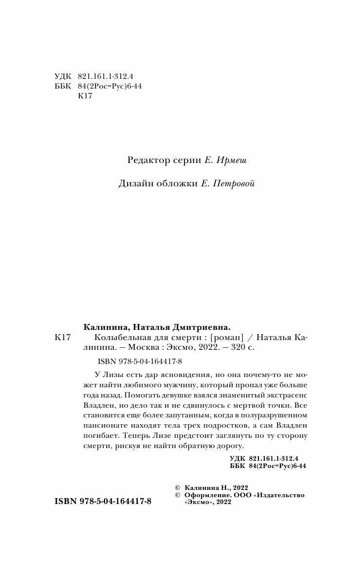 Книга: Колыбельная для смерти (Калинина Наталья Дмитриевна); ООО "Издательство "Эксмо", 2022