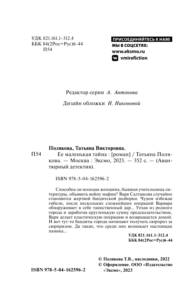 Сервис сравнения цен СкидкаГИД предлагает сравнить цены на товар «Книга: Ее маленькая тайна (Полякова Татьяна Викторовна); ООО "Издательство "Эксмо", 2022»