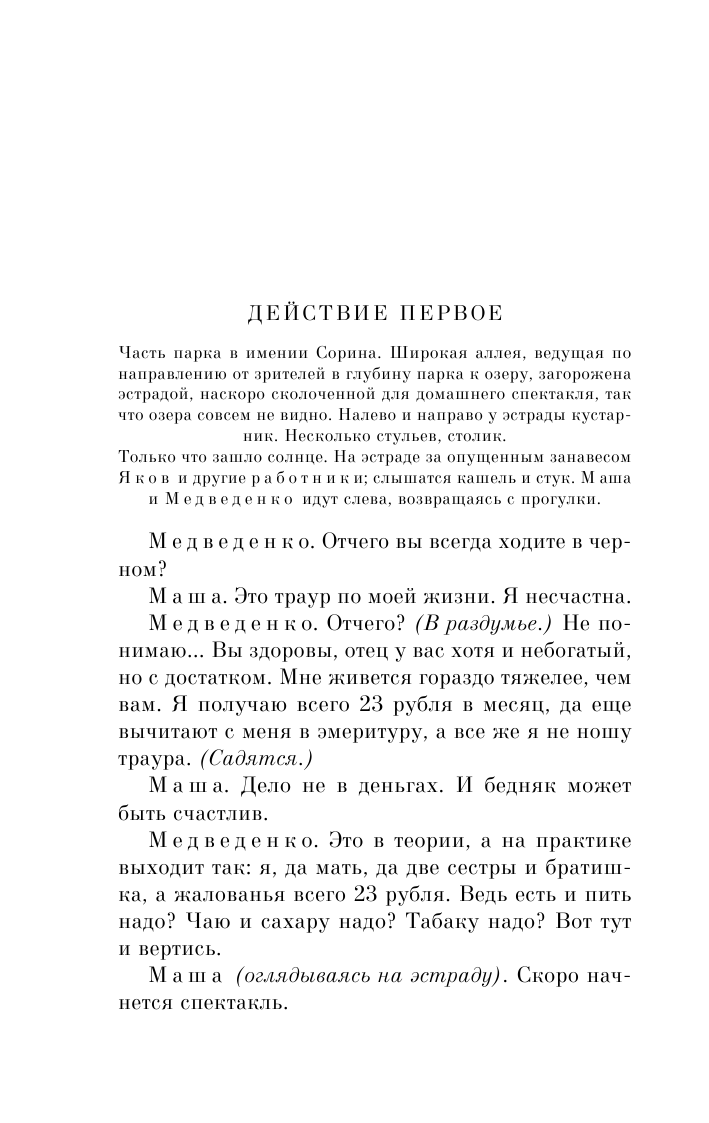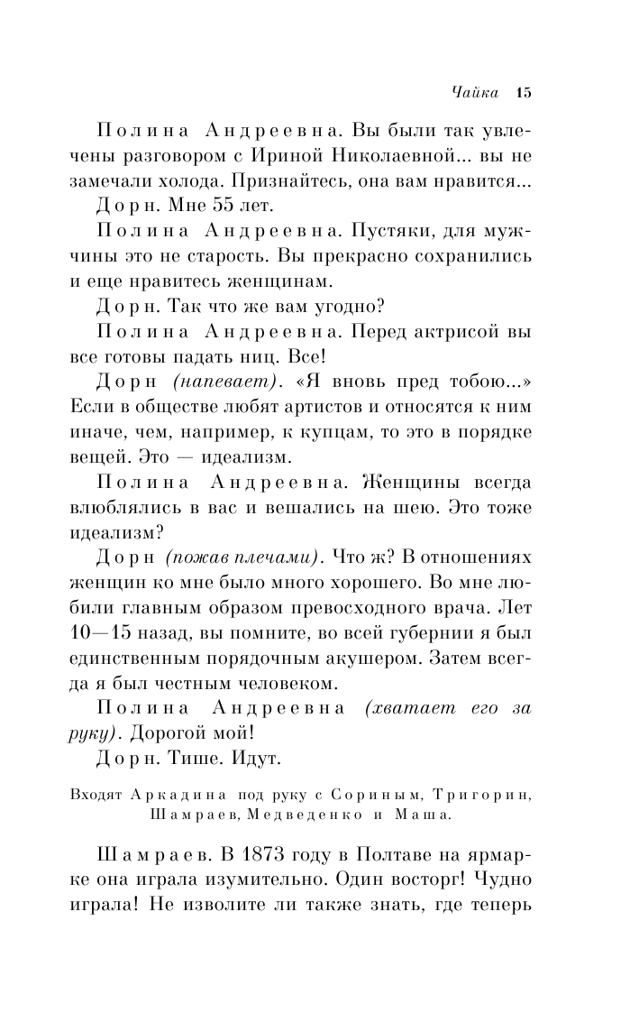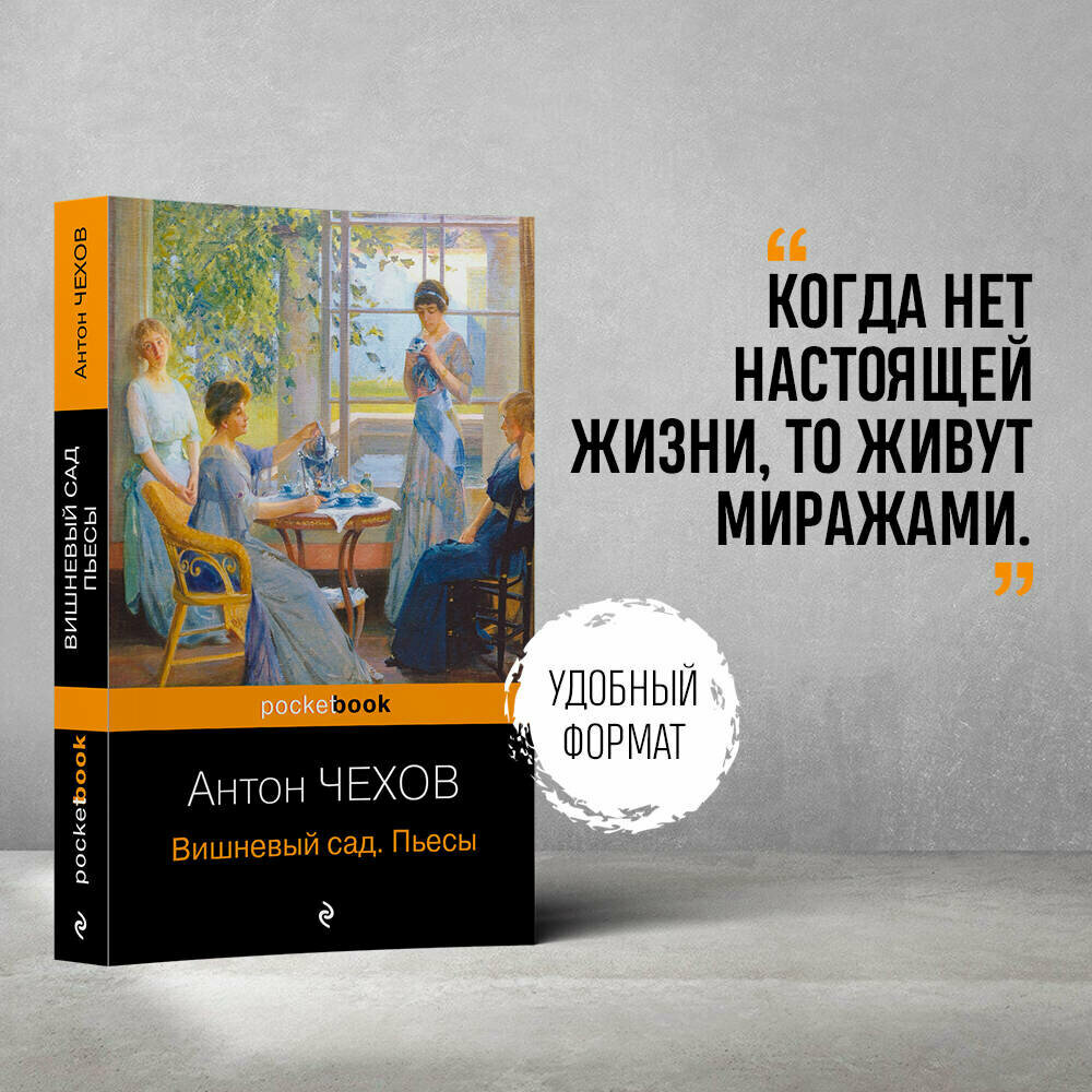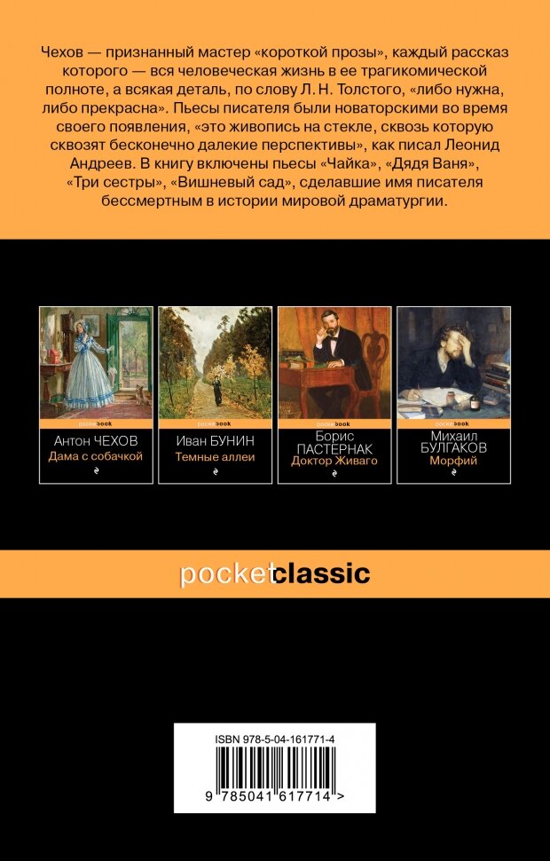 Удобное, удачное издание. Под обложкой обычного pocketbooka сразу четыре важнейшие пьесы: Чайка, Дядя Ваня, Три сестры и Вишнёвый сад. Бумага серая, но не тонкая. Шрифт средний, не мелкий. Пьесы пронзительные, особенно меня впечатлили Чайка и Три сестры. Образы героев очень типичные для России, поэтому очень близкие. Настоящая русская классика. Рекомендую к покупке.