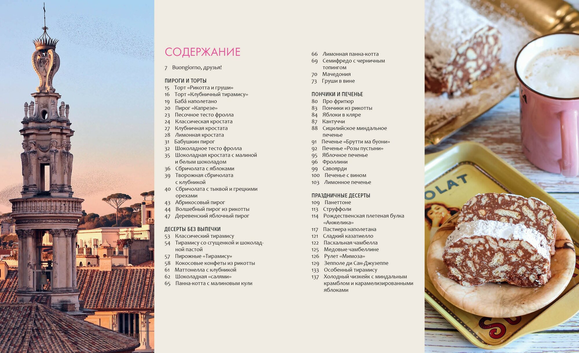 Это вторая книга автора, первая была про пасту. Книга Больше чем тирамису просто идеальна! Очень красивые фотографии невероятно аппетитных десертов. Есть и торты с пирогами, и другая выпечка, и десерты без выпечки. Сладкое на любой вкус! Всё ингредиенты доступные, сами рецепты расписаны подробно и простым языком. И всё сопровождается просто фантастическими фотографиями потрясающей Италии!