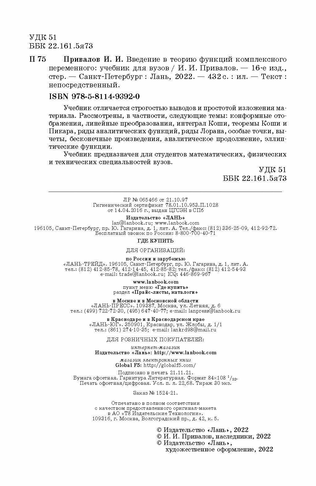 Сервис сравнения цен СкидкаГИД предлагает сравнить цены на товар «Книга: Введение в теорию функций комплексного переменного. Учебник (И. И. Привалов); Издательство ЛАНЬ, 2022»