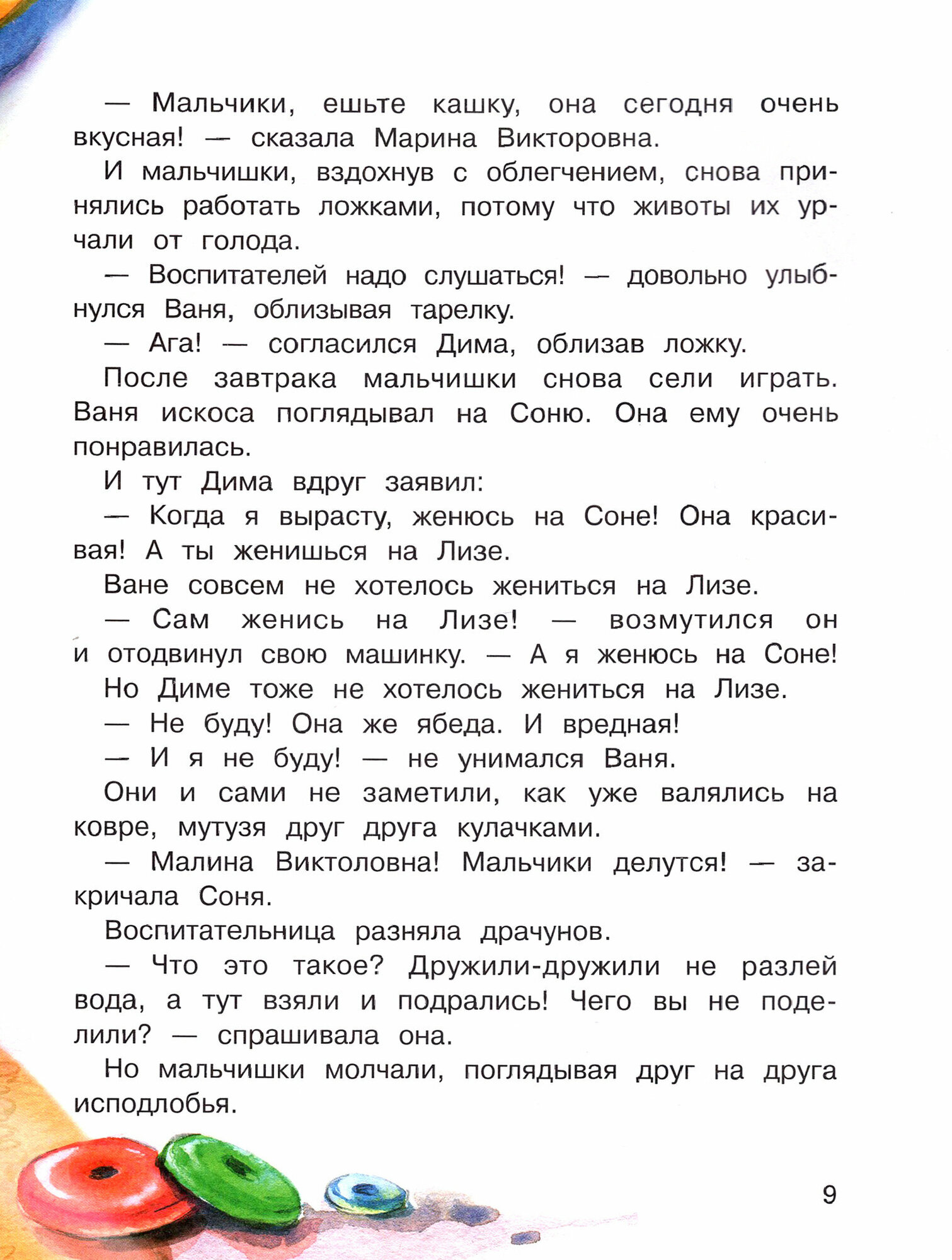 Если вы думаете, что у малышей-дошкольников несерьезные и детские проблемы, вы глубоко ошибаетесь! Проблем у них хватает и вполне себе взрослых! Например, на ком жениться: на Соне или на Лизе? Как быть, если Лиза – ябеда и вредная, а с Соней нужно всё время играть «в сыночков»? А, может, лучше совсем не жениться, чтобы эти девчонки не командовали? На такие вопросы не сразу ответишь! Или, как, например, объяснить воспитательнице Марине Викторовне, что её очки в синем футлярчике Ваня и Дима закопали не из-за баловства, а потому что играли «в археолухов»? И почему, когда стоишь на голове и смотришь вокруг, тарелки не падают?