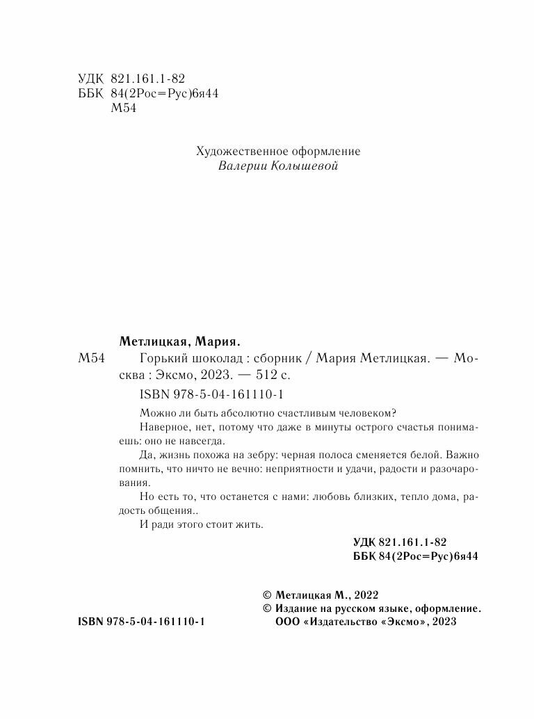 Книга: Горький шоколад (Метлицкая Мария Робертовна); ООО "Издательство "Эксмо", 2022