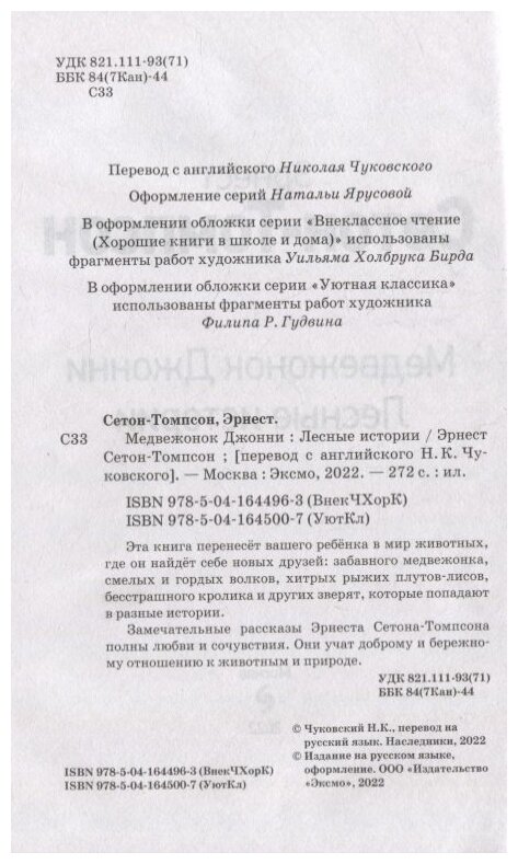 книга из серии «Уютная классика» в твёрдом переплете с главными героями на обложке - медвежонком Джонни и его матерью Грэмпи. В данном сборнике девять рассказов и повестей о животных в прекрасном переводе Николая Чуковского. Издание проиллюстрировано чёрно-белыми рисунками. -